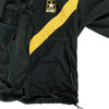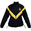 When my granny was ninety one, she did PT just for fun. When my granny was ninety two, she did PT better than you. Better get moving double time to catch up to cadence Gran and why not look the part too. US women's cut Army Physical Fitness Uniform (APFU) jacket, reporting for duty. These training jackets are wind and water resistant, with vents to the back under the chevron and armpits. The yellow V is somewhat reflective for low light visibility. Two zippered hip pockets stop your items going astray when hopping to that 1-2-3-4 and inside is black sporty mesh. A draw cord bottom, wrist tabs for adjustable cuffs and embroidered US Army and star finish this jacket off.