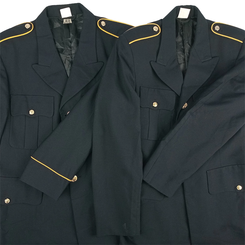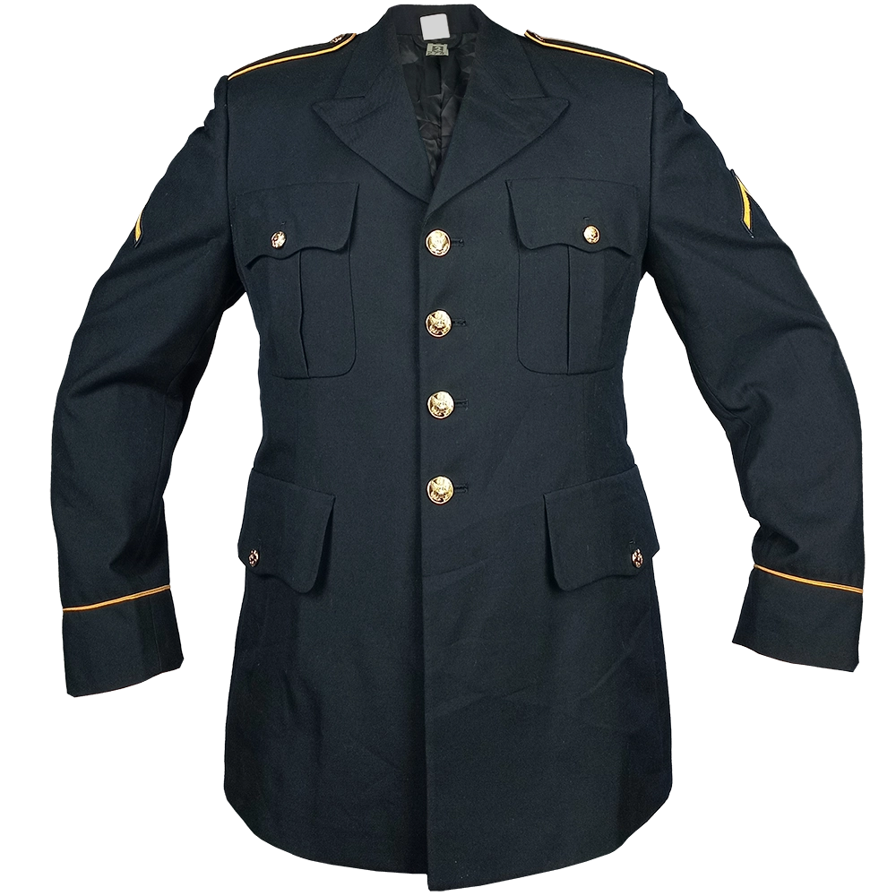 A tailored, single-breasted very dark blue coat featuring gold buttons and epaulettes from the US Army. Within this bunch are a mix of jackets with thin yellow arm bands or without, and if patches are present, will vary. Designed and worn for formal and ceremonial occasions, it reflects US Army tradition and professionalism, offering a distinguished, sharp appearance that honours military heritage and service excellence.
