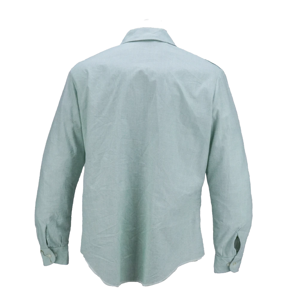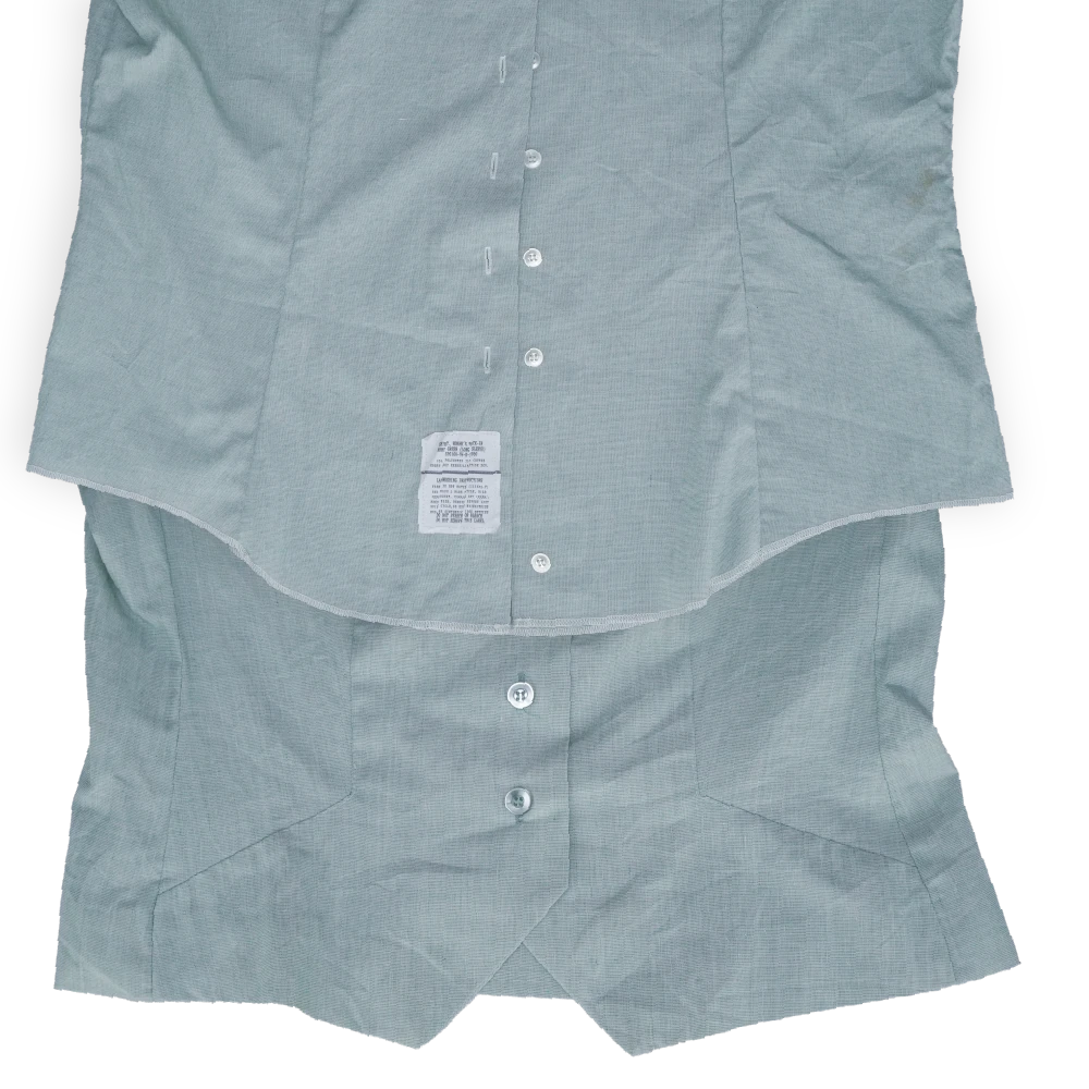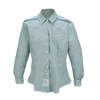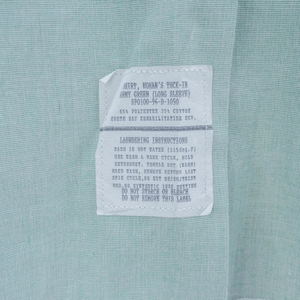 US Army women's service dress shirt in olive poly / cotton fabric. Lightweight construction with a structured, tailored fit, featuring a button-front closure, long sleeves with buttoned cuffs, and a pointed collar. Some variants include shoulder epaulettes, with both tuck-in and overblouse hem styles present.