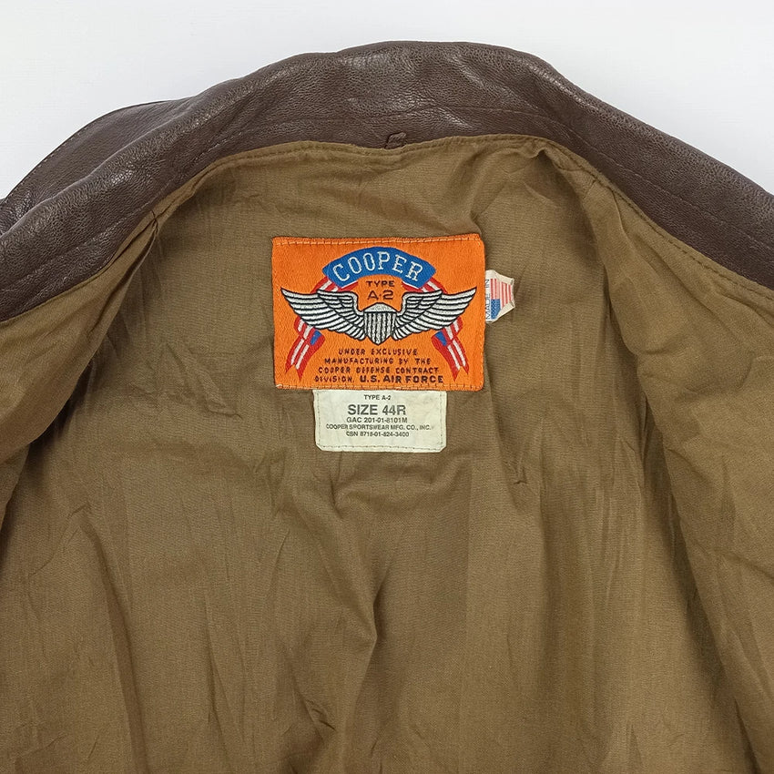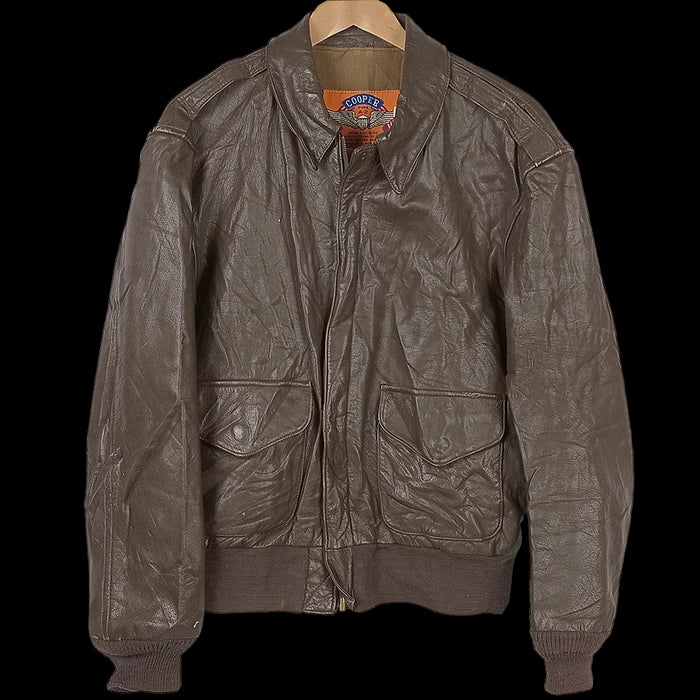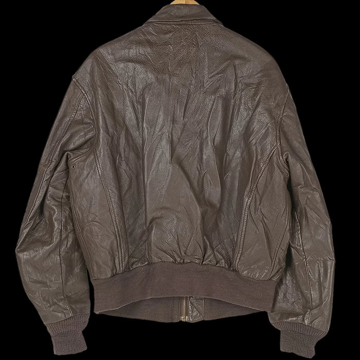 Commercial leather flight jacket styled after the Type A-2, featuring elasticated wool cuffs and waistband with two flap-closure hip pockets. Sized 44R (Large) and weighing approximately 2.1 kg.