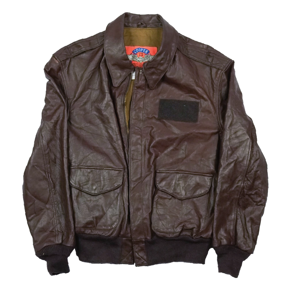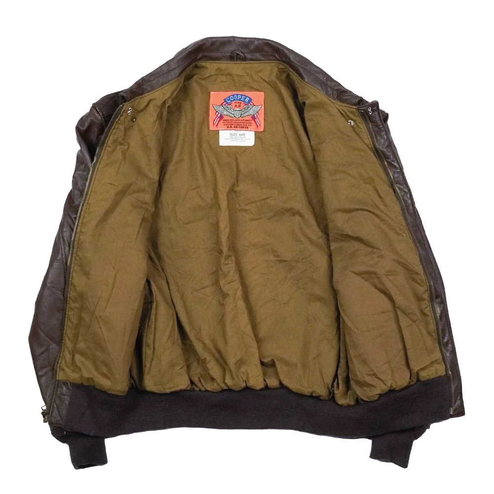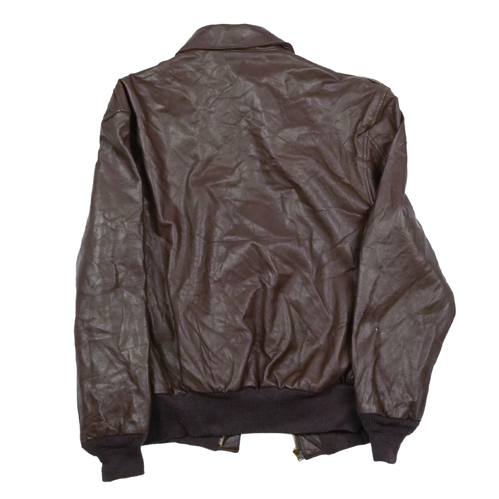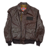 Commercial leather flight jacket styled after the Type A-2. Features elasticated wool cuffs and waistband, with two flap-closure hip pockets.