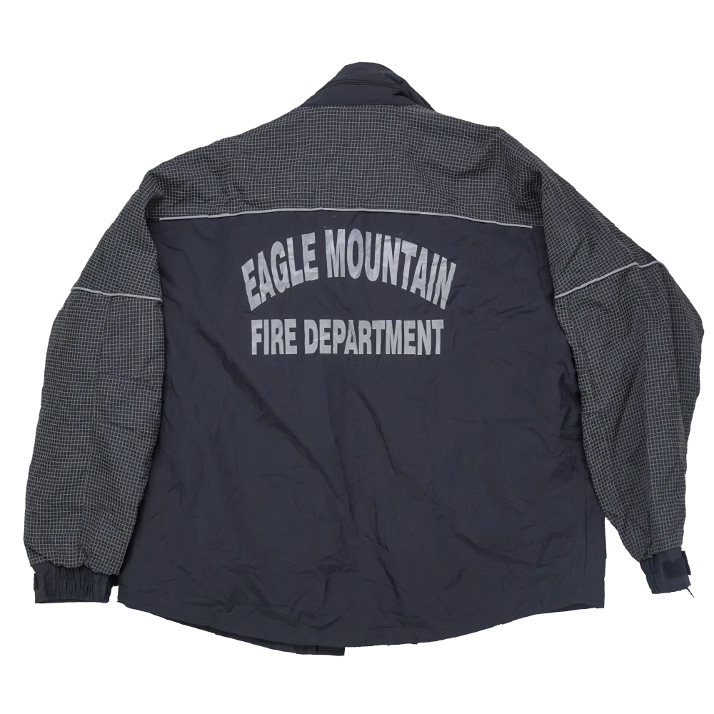 The back is printed “Eagle Mountain Fire Department” and the chest includes a name tape and department patch. Labelled Large Regular.