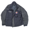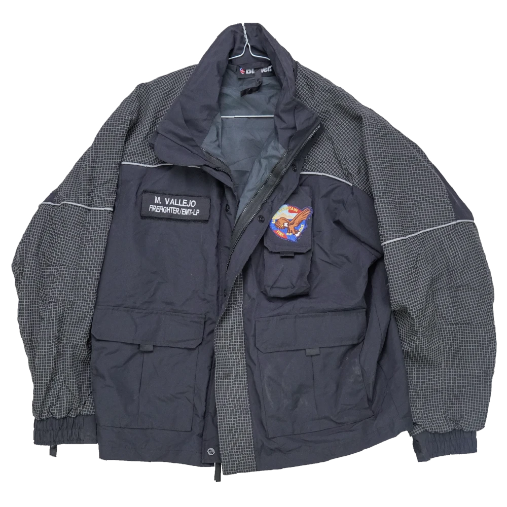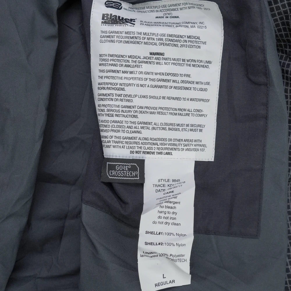 Blauer multi-use emergency medical jacket in dark navy with contrasting grid-pattern panels. Made with a nylon shell and laminated polyester GORE® CROSSTECH® lining. Features a high collar, full front zip with snap storm flap, and multiple front cargo pockets.