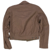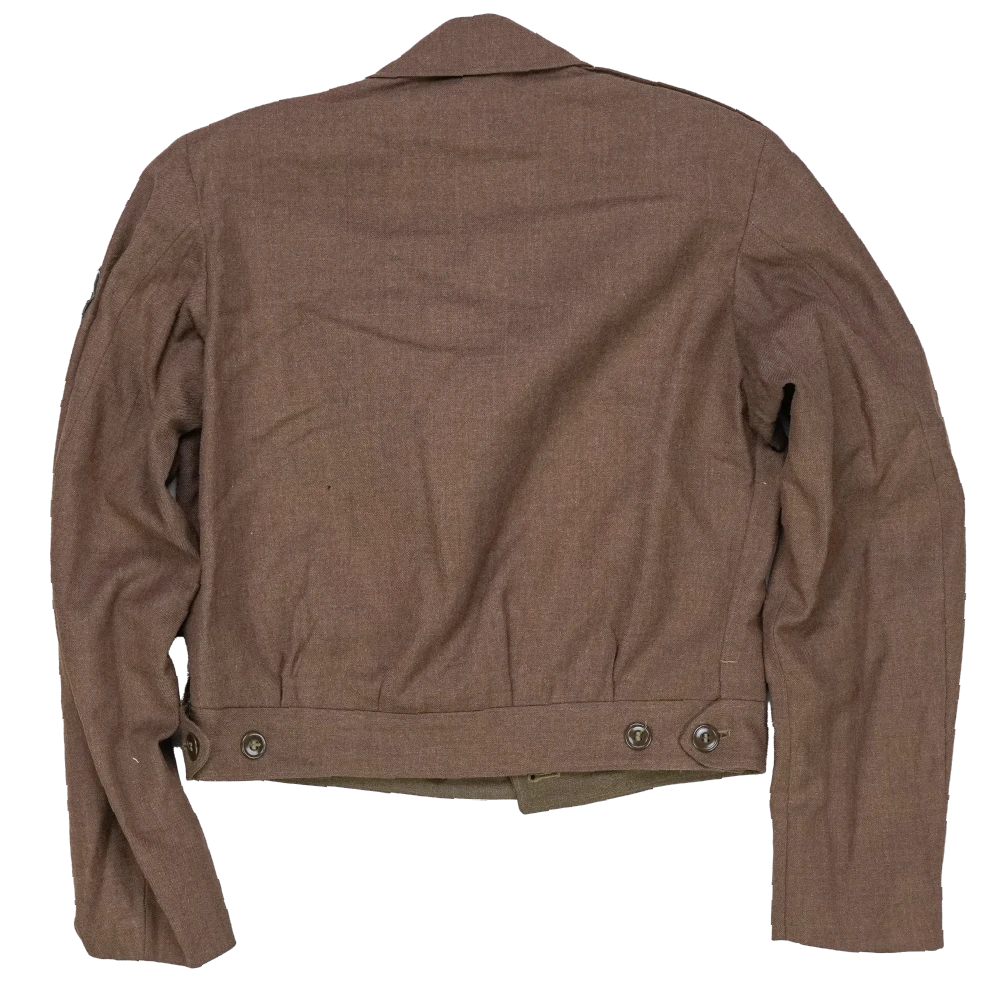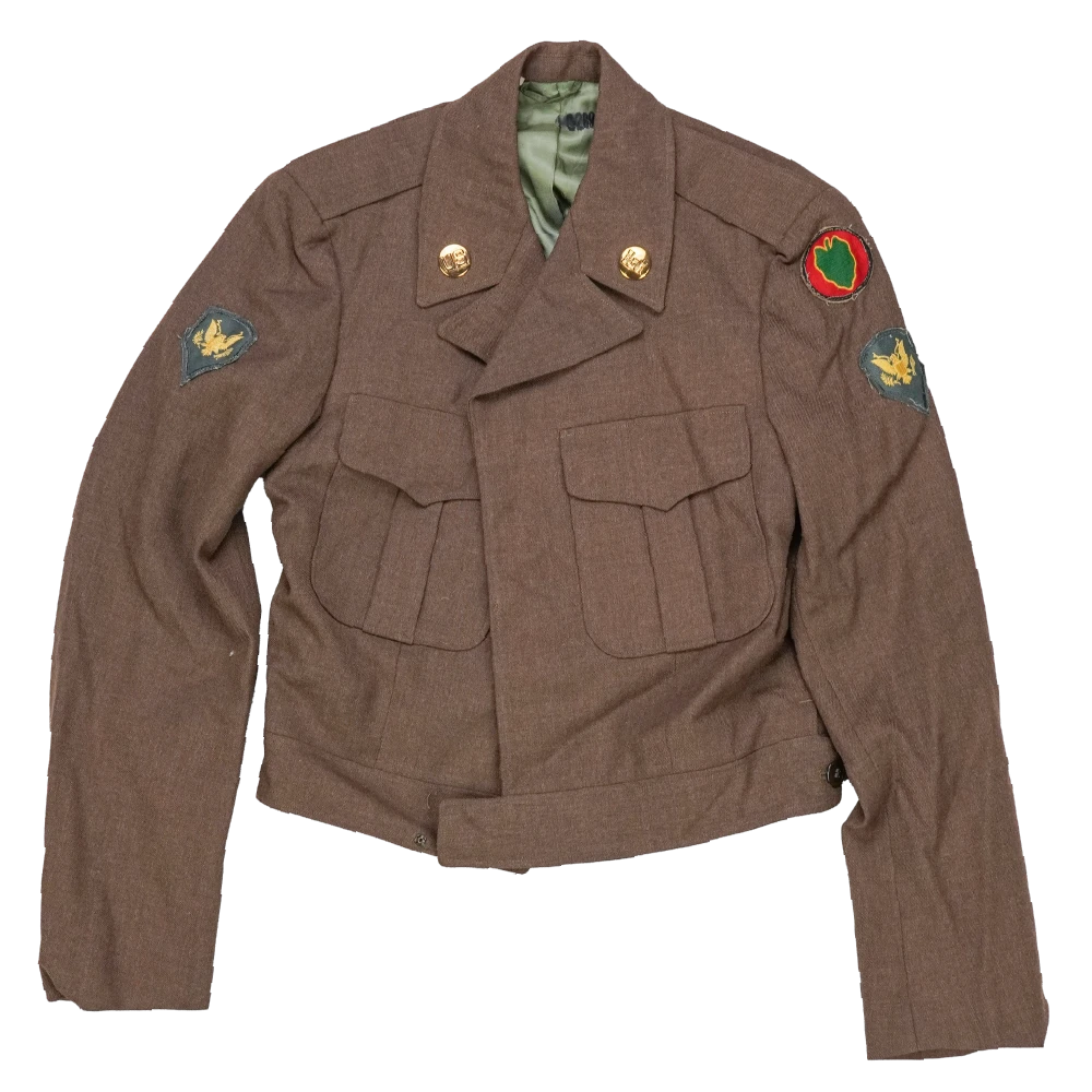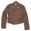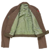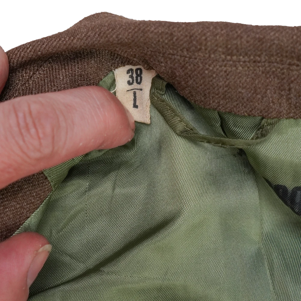 US M-1950 wool Ike jacket in a medium long size. This waist-length uniform jacket is made from wool and features a structured military dress design with a front button closure.