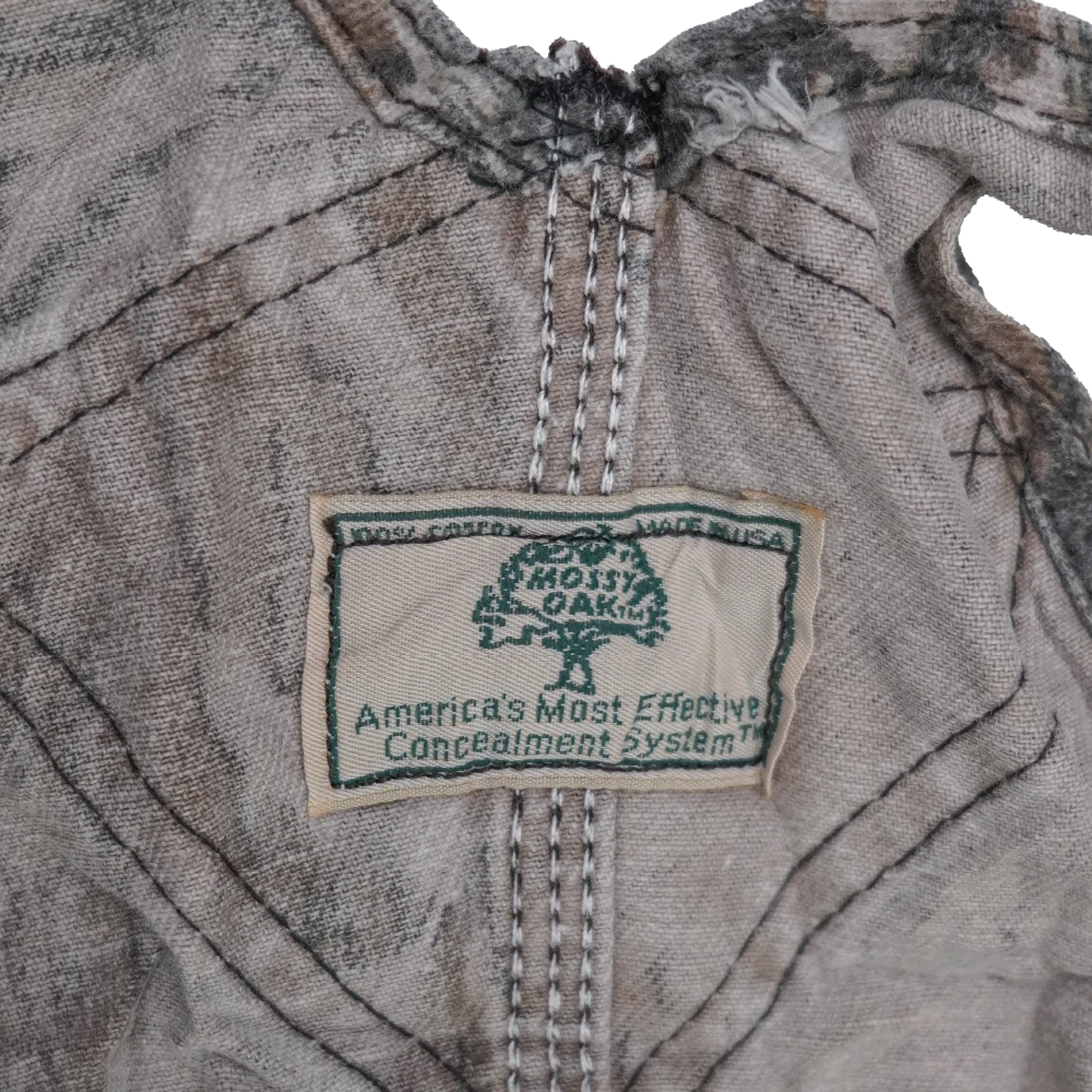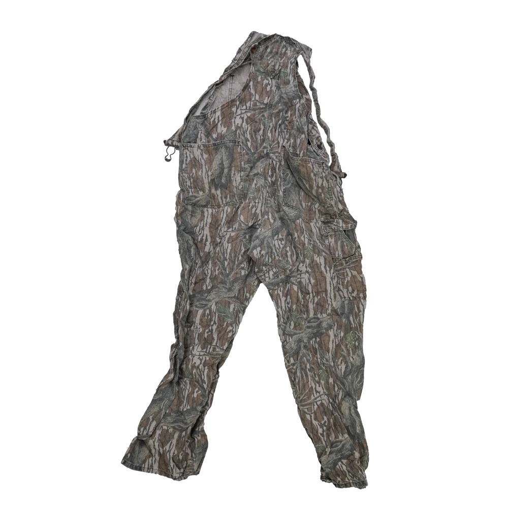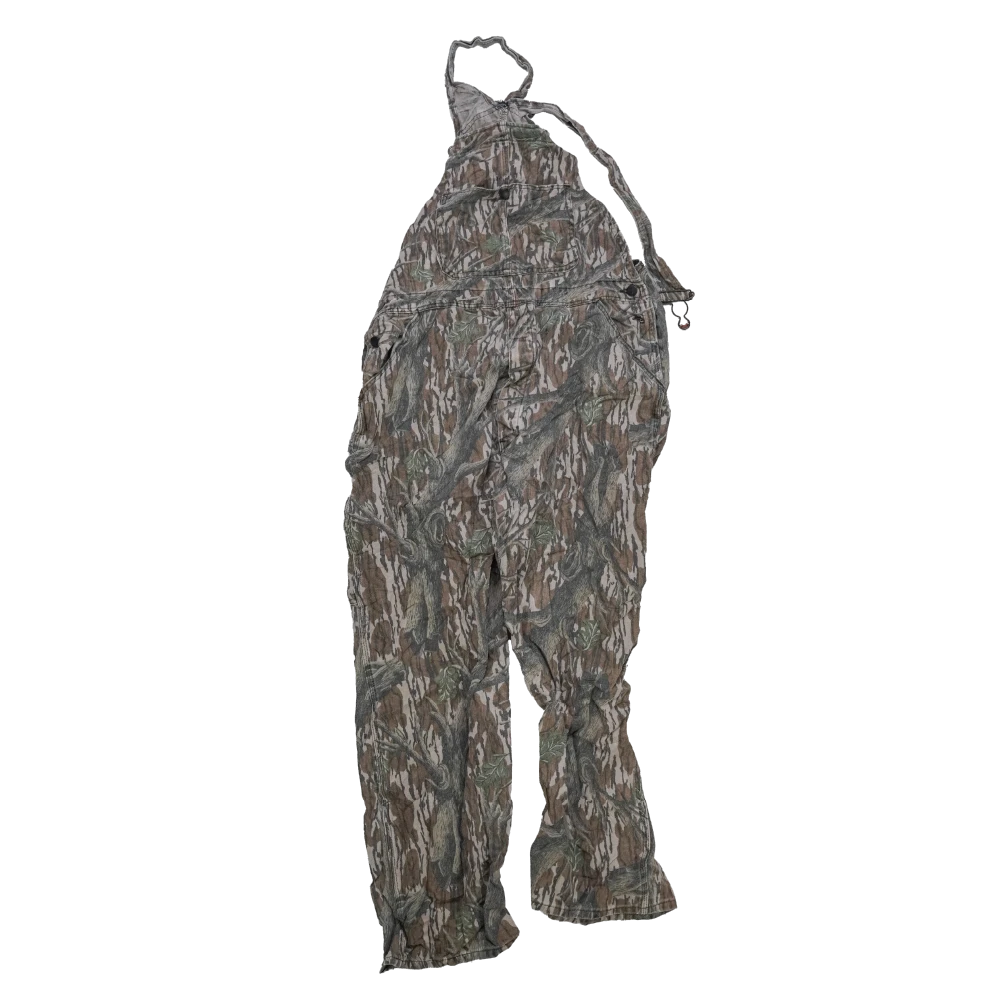 US-made Mossy Oak camouflage bib overalls. Traditional bib-style overalls with a full camouflage pattern.