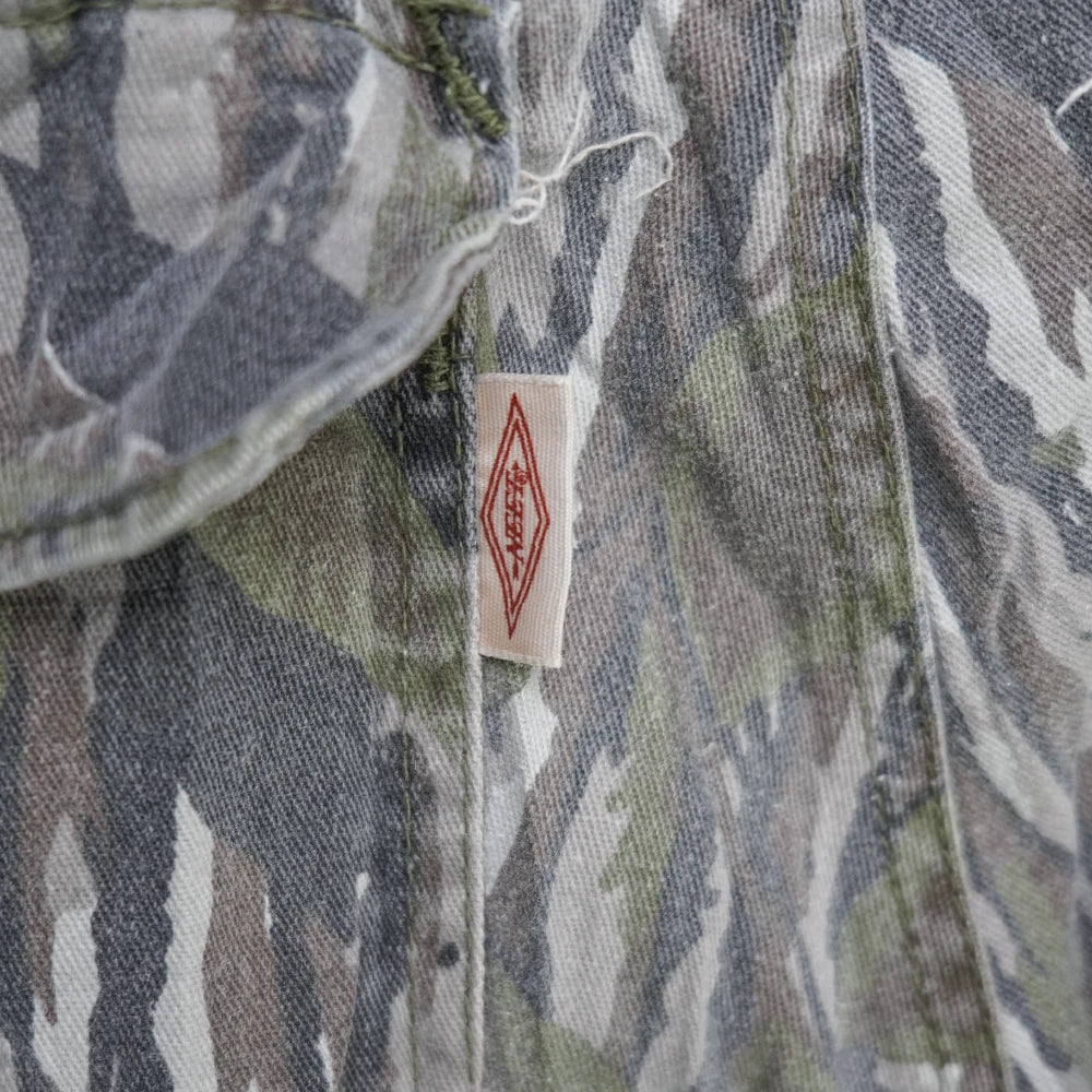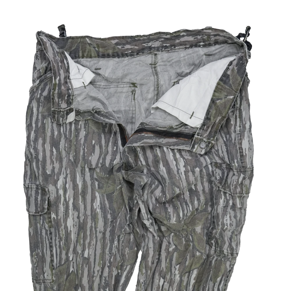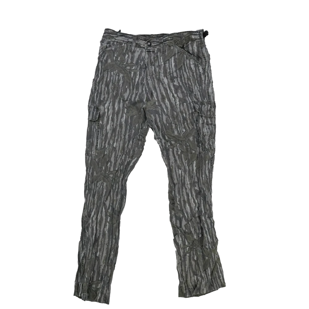 Commercial outdoor trousers designed with camouflage fabric for concealment in wooded environments.