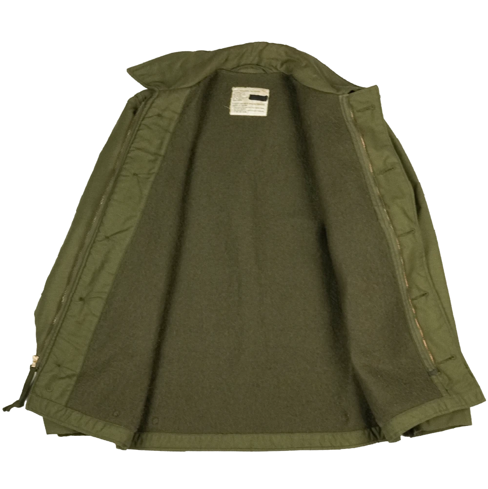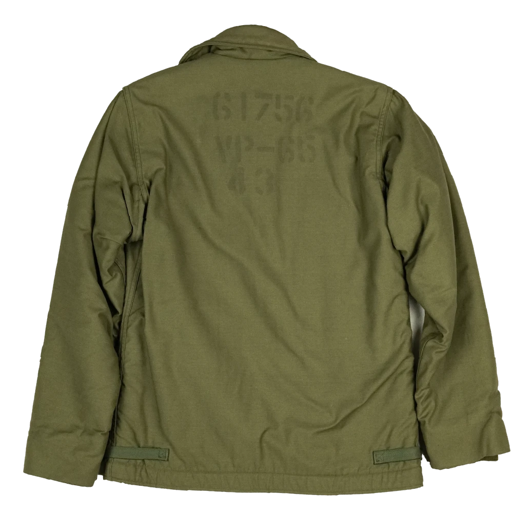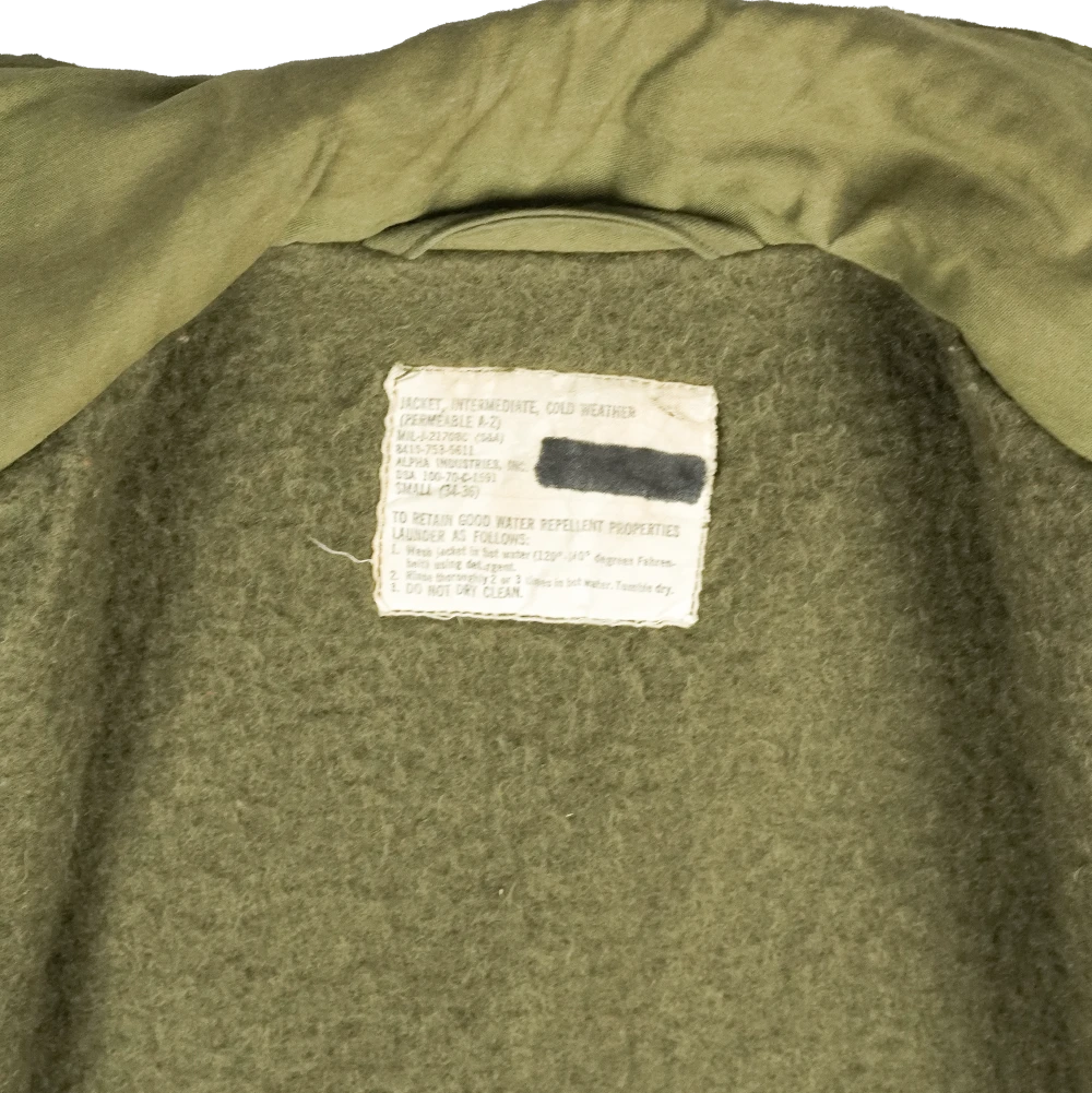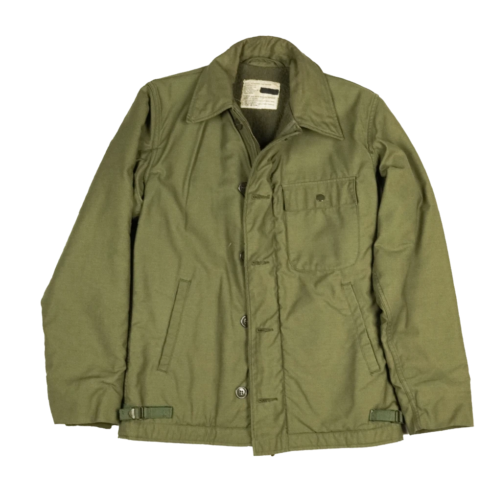 US Navy A-2 deck jacket in small size. This jacket is a surplus example with a straightforward, heavy-duty construction typical of deck jackets, and retains its original military styling.