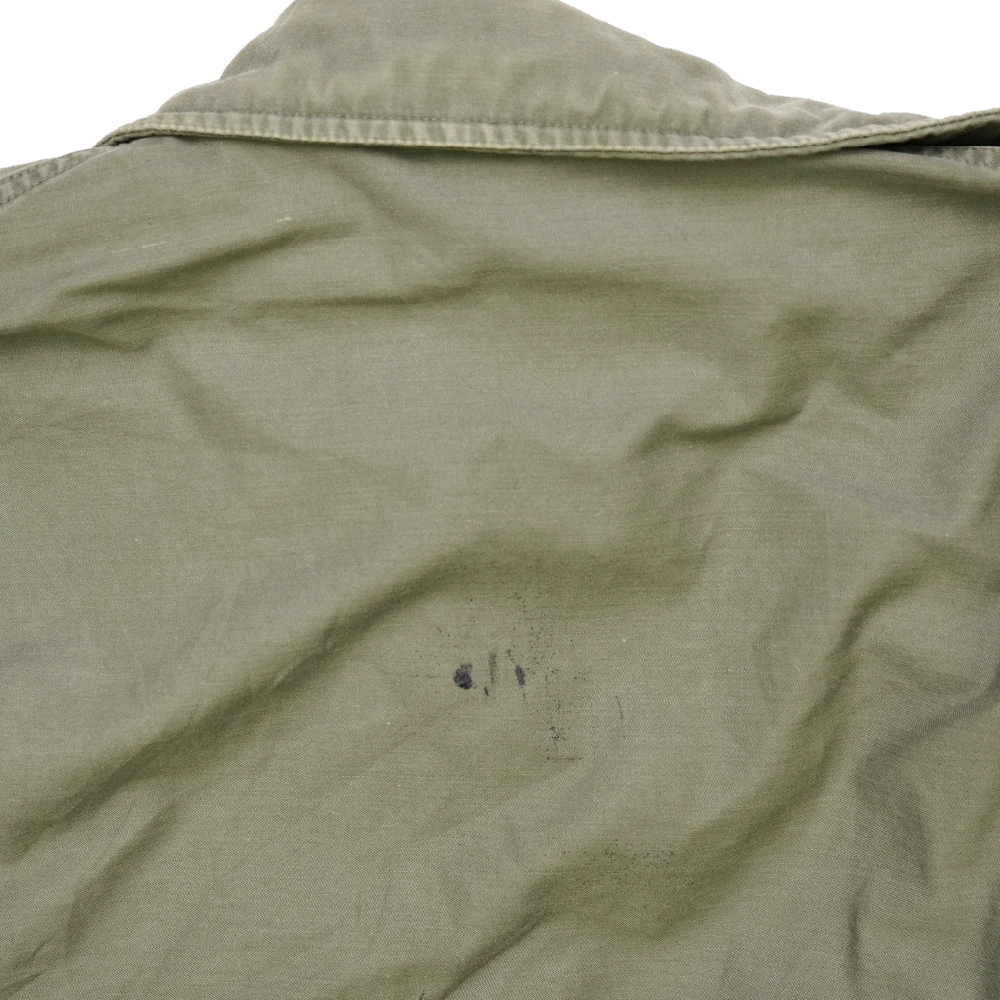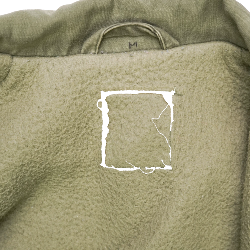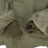 There is no label present. A tear and staining are visible around the cuff area, with additional staining on the back.
