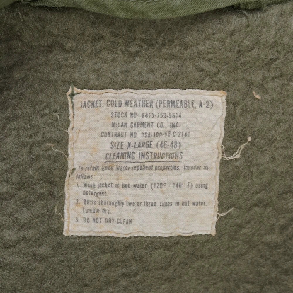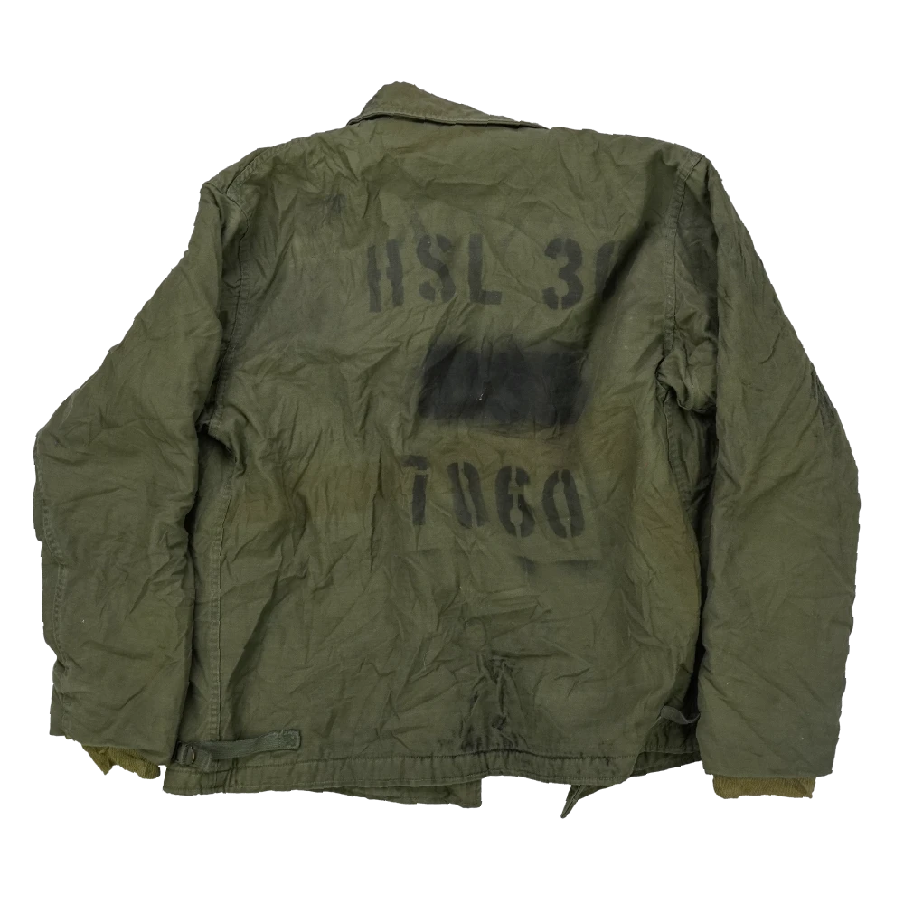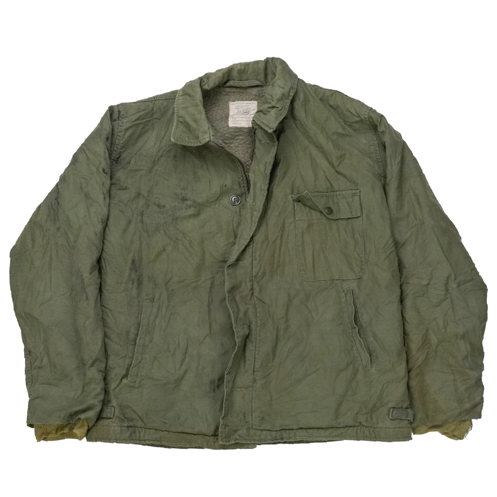 US Navy A-2 Deck Jacket in XLarge. Heavy outer shell with full front zip closure and knit cuffs. Classic deck jacket styling with simple, functional construction.