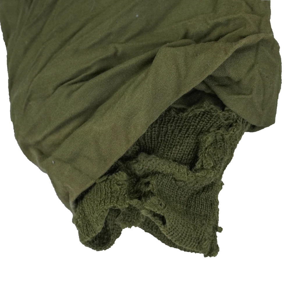 Black marks and what appears to be charcoal dust are present over much of the garment. There are holes in the cuffs.