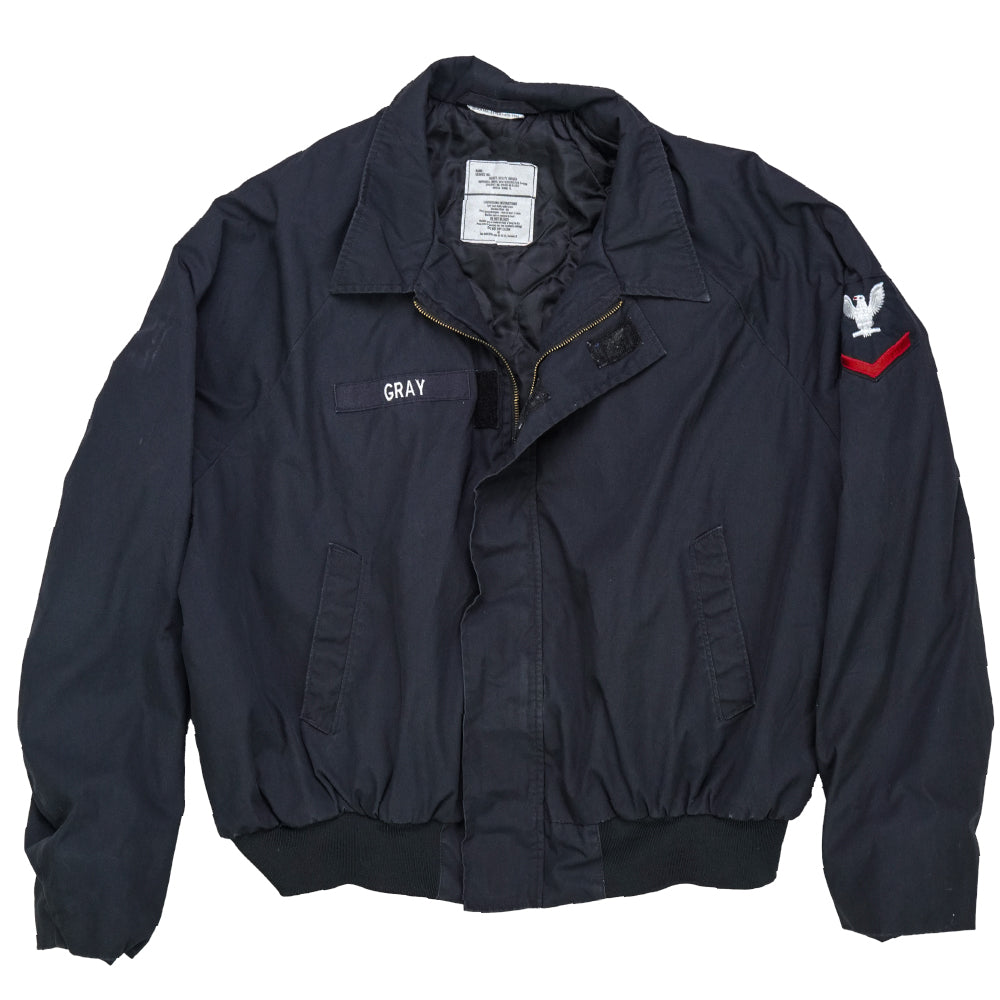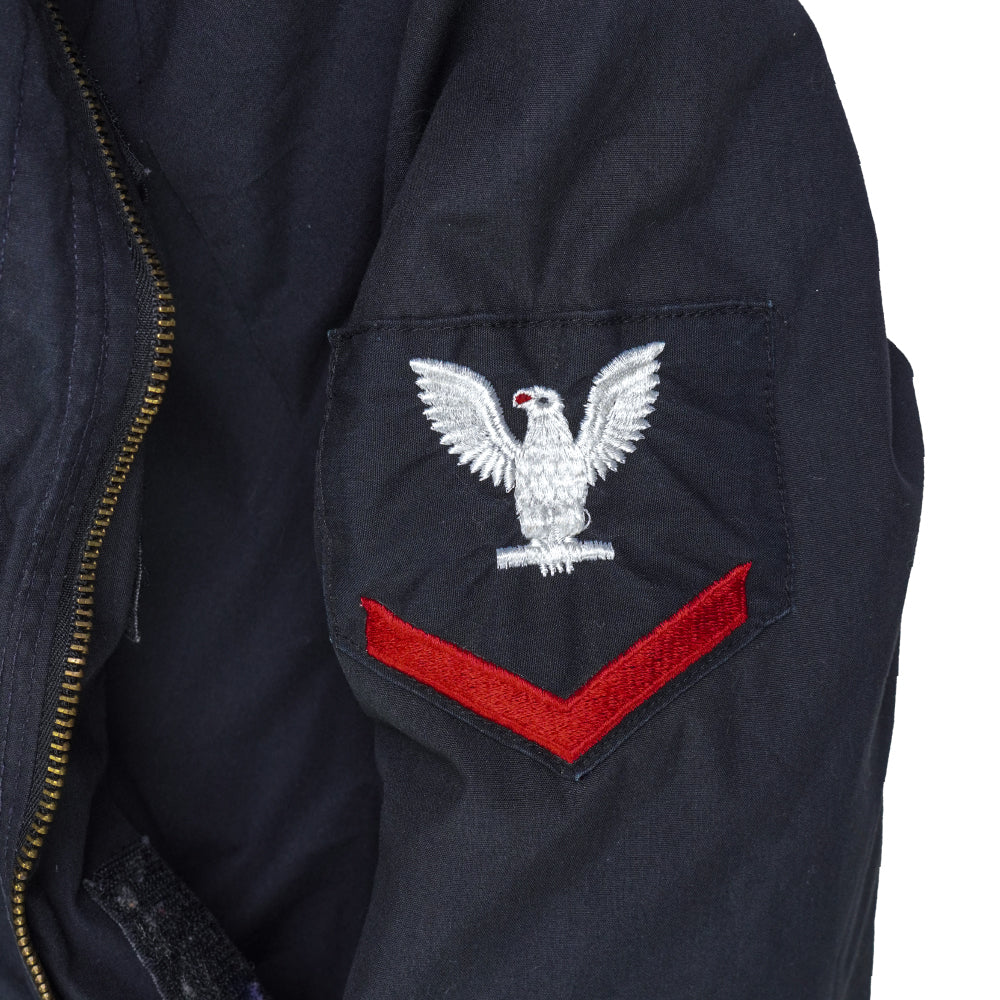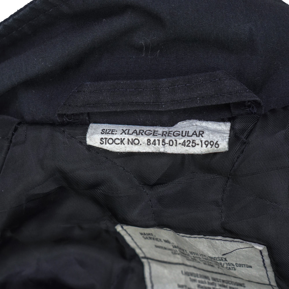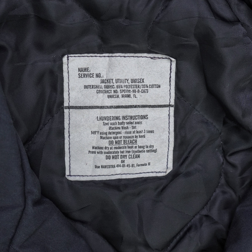 US Navy lined utility jacket with a durable outer shell and internal lining for added warmth. The jacket features a simple military utility design and was manufactured in 1998.