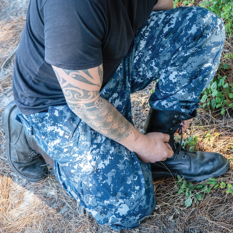 As you'd expect the uniform has many of the usual US military features made from a hard wearing 50/50 cotton and nylon mix. The waist is partly elasticated around the hips and has standard 2" belt loops all the way around. The fly has a zipper and a button at the top to secure them to your waist. Like all good military uniforms it has 2 slash pockets and 2 elasticated cargo pockets with a single button each. At the rear the trousers sport 2 back pockets with dual button closure. In line with the other US military branches, these uniforms offer the same quality you would expect and a funky pattern for civilian wear.