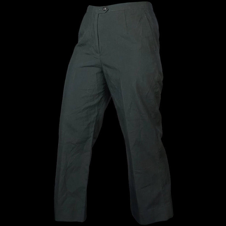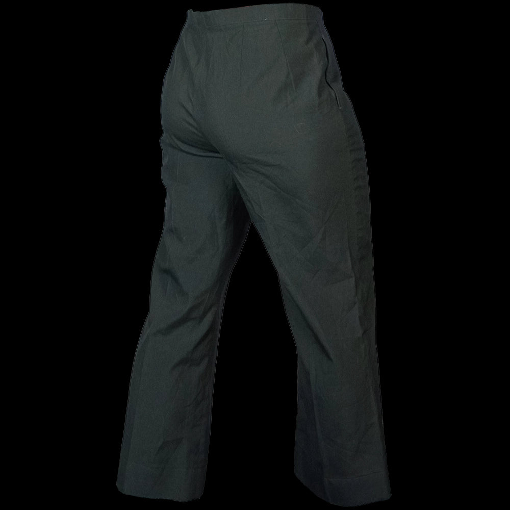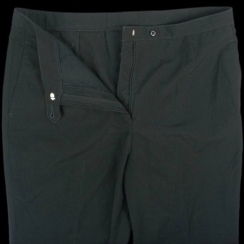 Women's nice black pants! These are the unbelted version with no belt loops or back pockets. Whether you're finishing a uniform collection or in the professional environment, a pair of smart-casual black pants doesn't go astray. As a mix from over the years, these trousers are variable poly-wool blends, variable weaves (some may be the tropical version) and some may need hemming.