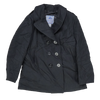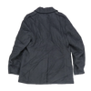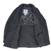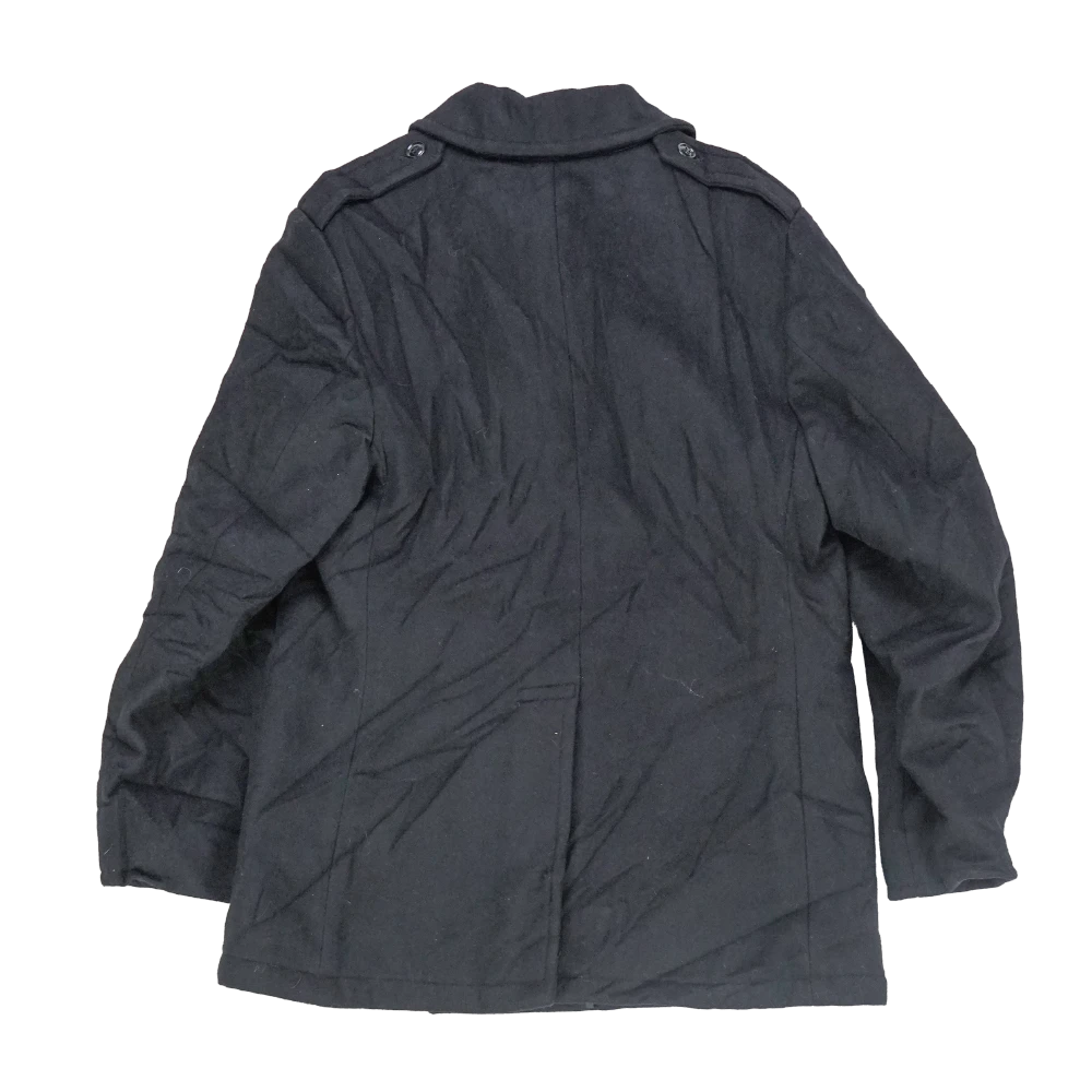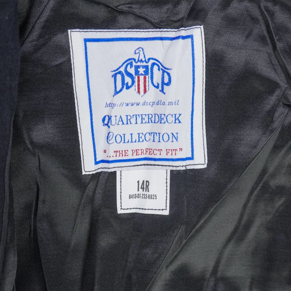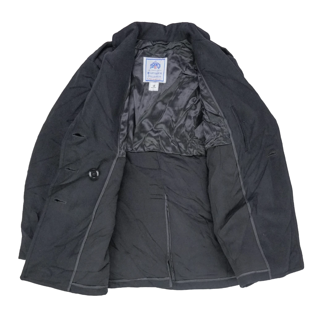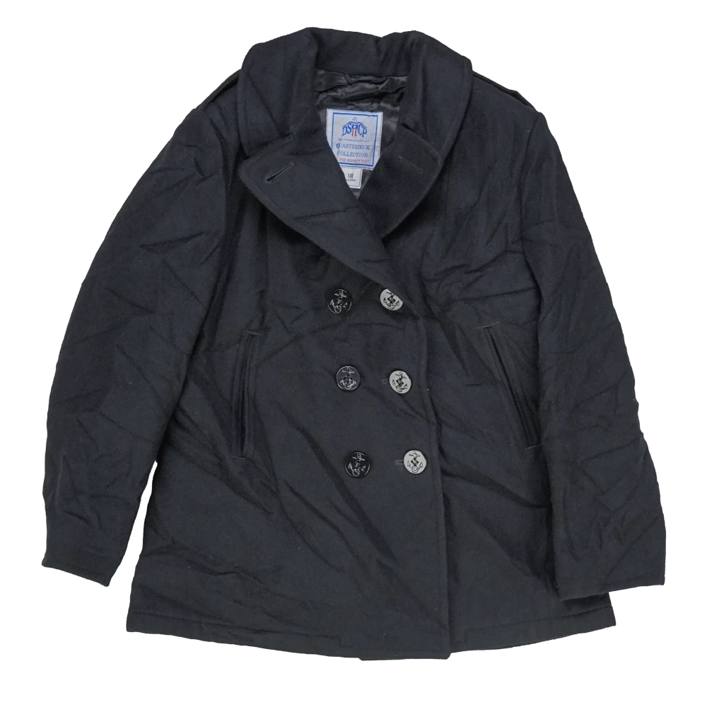 US Navy women's wool pea coat with a heavy wool outer and smooth inner lining. Features a double-breasted front with anchor-style buttons, wide lapel collar, and two front hand pockets. Interior includes a chest pocket and partial lining for structure and comfort.