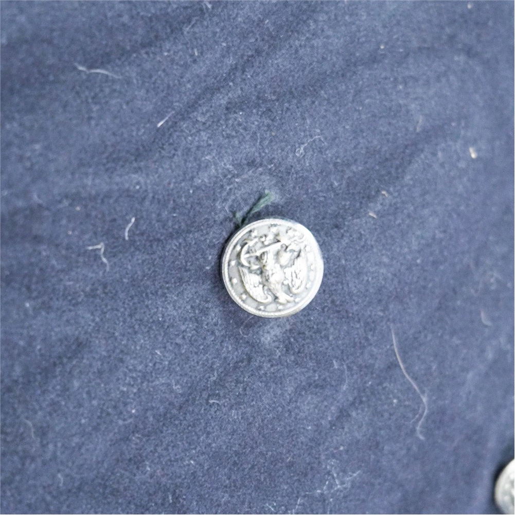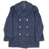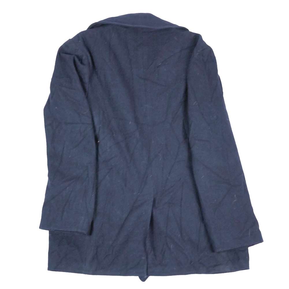 US Navy wool pea coat with metal buttons bearing US Navy insignia. The coat includes hip pockets and two internal pockets.