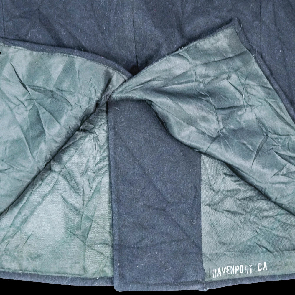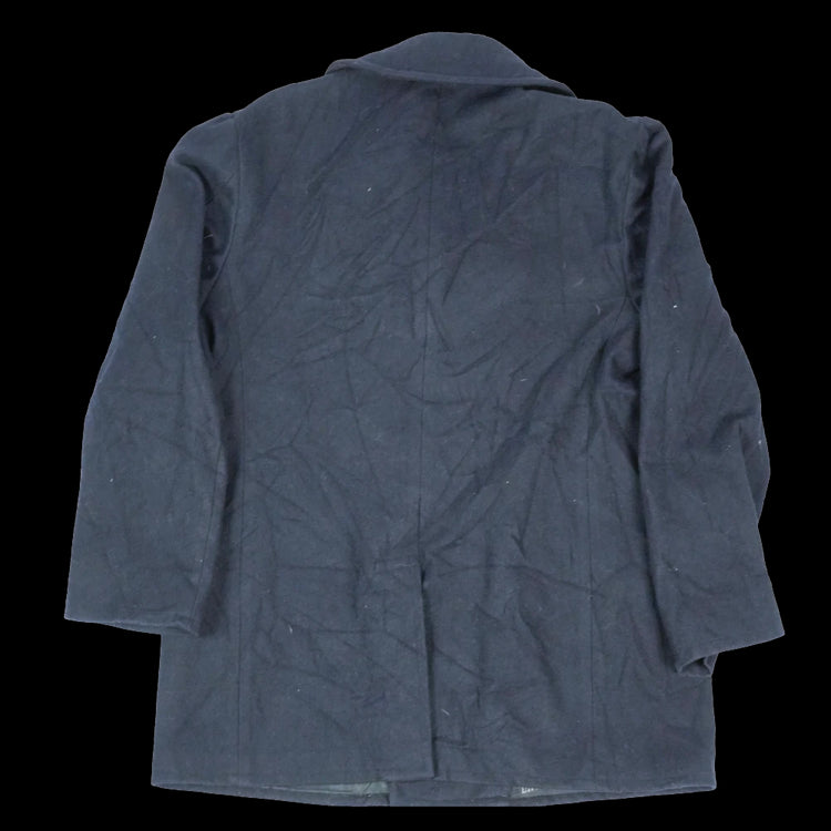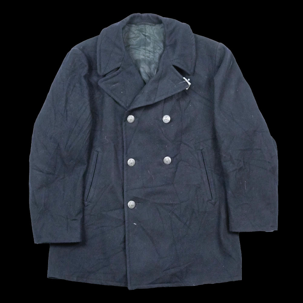 US Navy wool pea coat with a traditional double-breasted design. The coat features metal buttons with US Navy insignia, hip pockets, and two internal pockets.