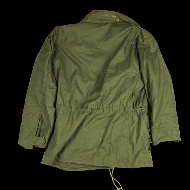 Commercial US-style M65 jacket in olive drab. Constructed from a cotton/polyester fabric with a snap-up storm flap and hook & loop neck closure. The jacket includes drawstrings at the bottom hem and in the hood, along with multiple external pockets.