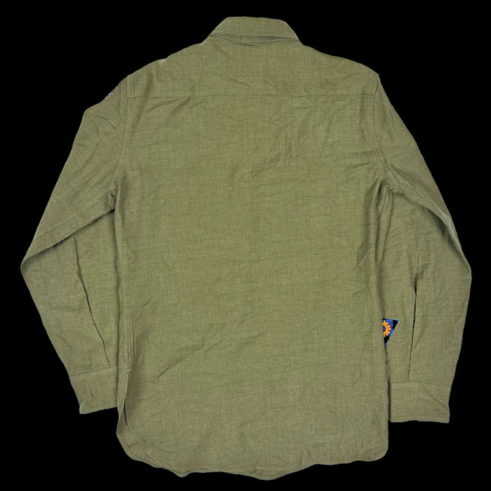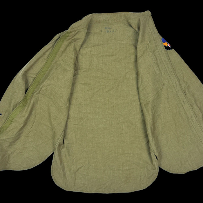 US World War II M37 wool shirt in Medium. This example features two chest pockets and buttoned cuffs. It displays US Army Air Force and Engineering Specialist cuff insignia.