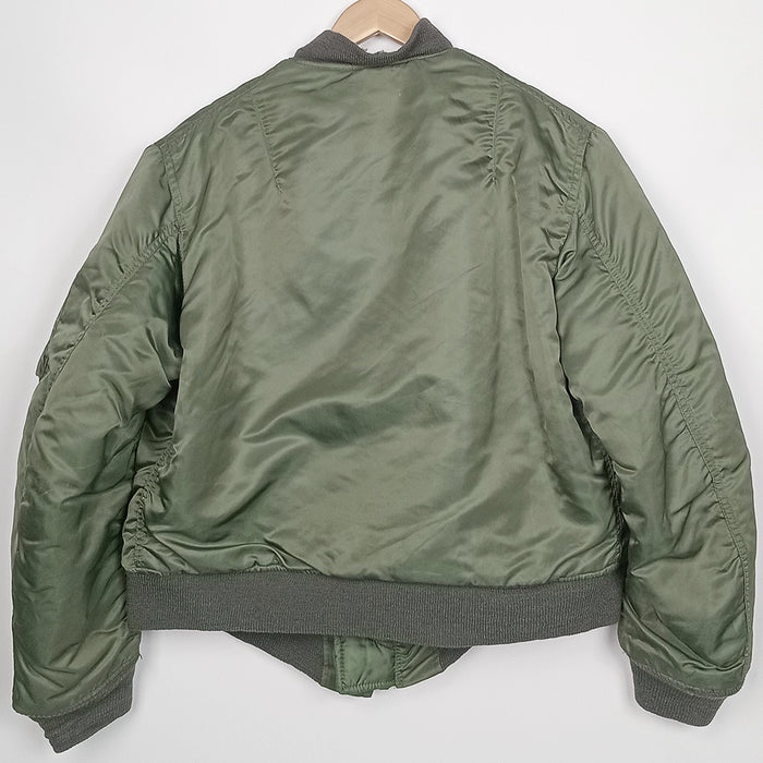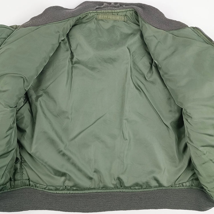 First issued in the early 1950s, the USAF MA-1 Intermediate Jacket replaced bulky leather flight jackets for improved mobility in jet cockpits. Constructed from water-resistant nylon with polyester filling, it was lightweight yet warm. Worn throughout the Korean and Vietnam Wars, the MA-1 became standard for U.S. aircrews and later a global fashion staple, prized for its rugged functionality and classic military design. This jacket (and the other for sale) do not have the reversible orange lining but subdued sage green, like the exterior. This jacket and the other are from 1987. This jacket is in very tidy condition except for the knit inner neck, where the fabric has come away from the bottom edge (the outer side is still intact) and small hole to the right knit cuff. Very light scuffs to the outer fabric and faint white marks down the left sleeve.