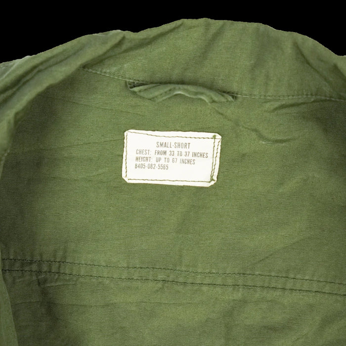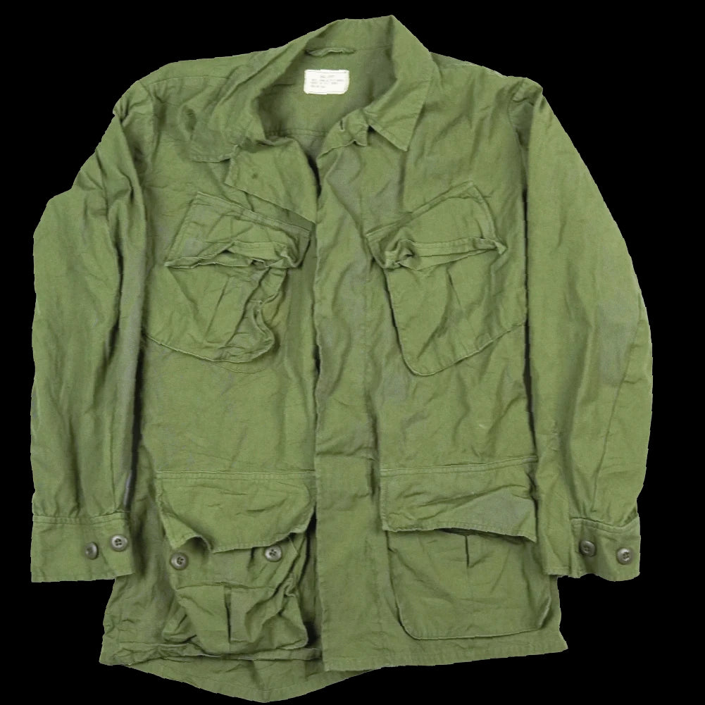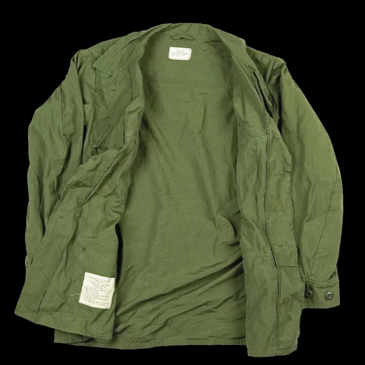 USGI 3rd pattern jungle fatigue shirt in poplin, non-ripstop construction. This is the four-pocket design with button-adjustable cuffs.