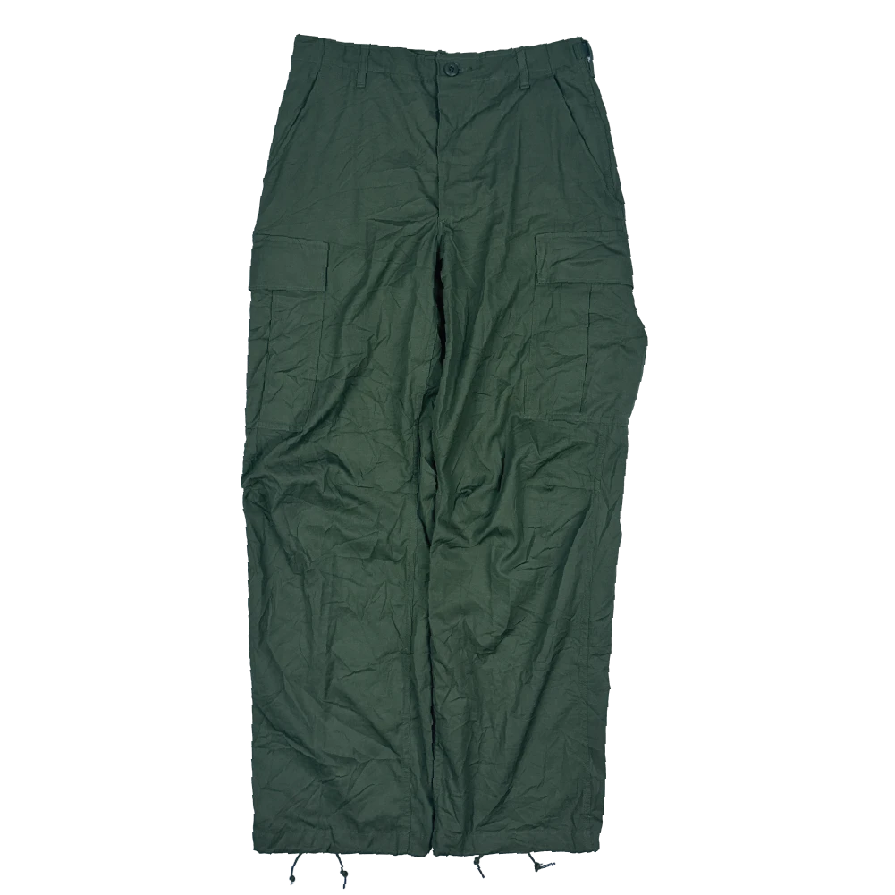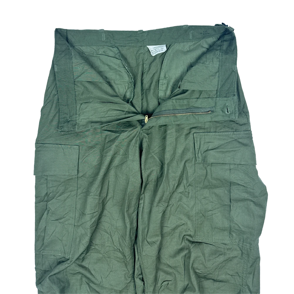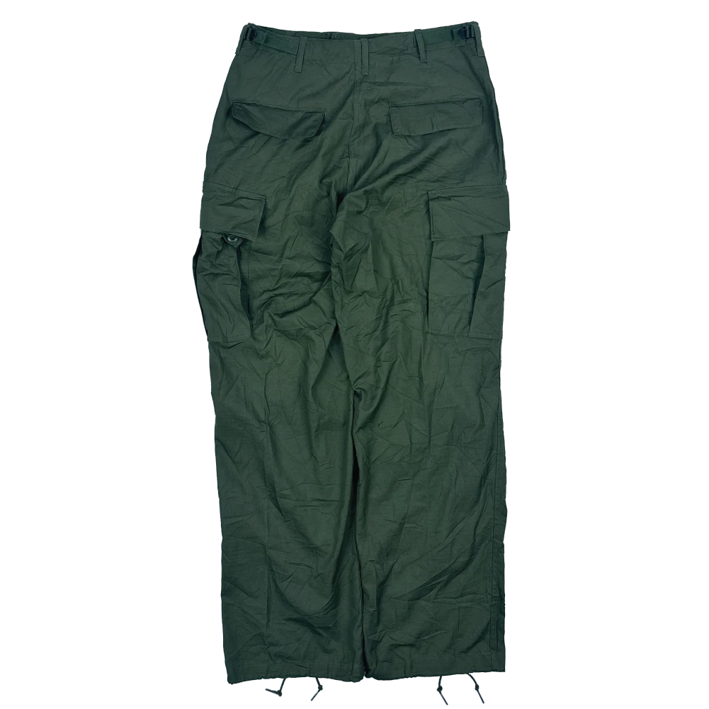 USGI 6th Pattern Jungle Fatigue Trousers manufactured in 1969. Constructed from ripstop poplin cotton fabric with a zip fly closure. Features two rear button secured pockets and two cargo pockets on the legs, with adjustable waist straps and draw cords in the leg cuffs.