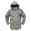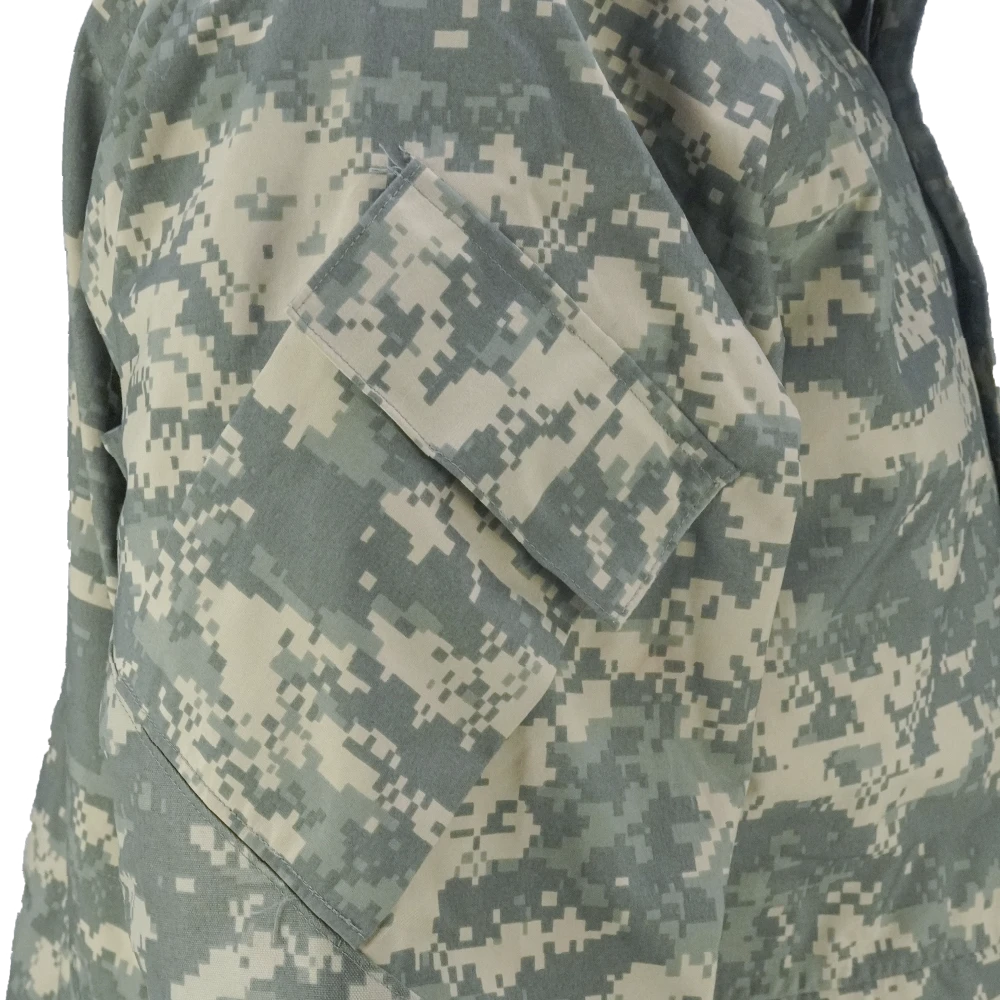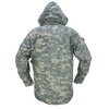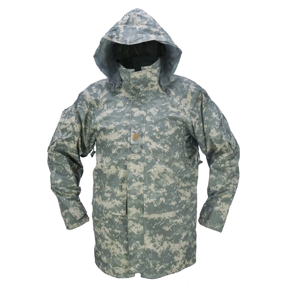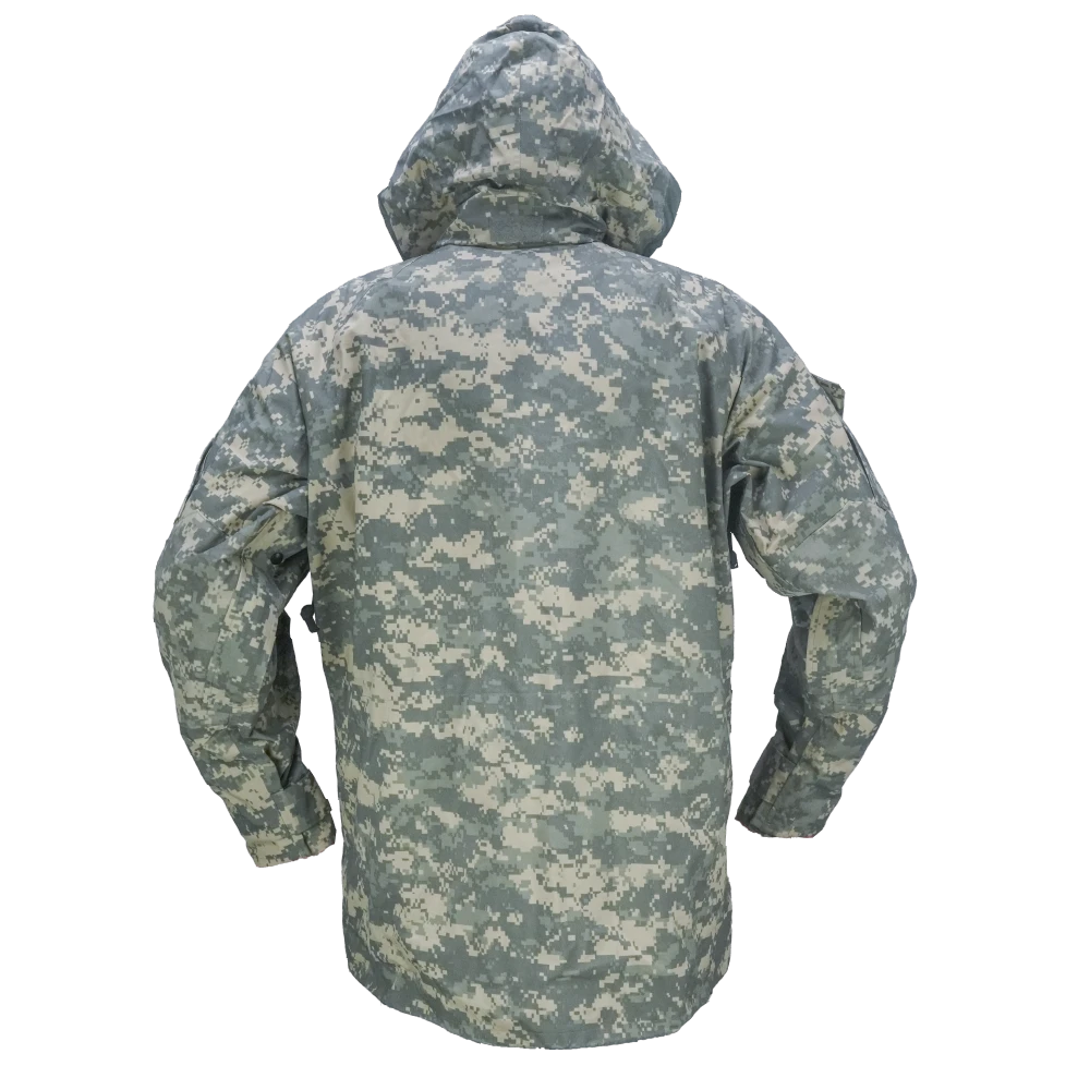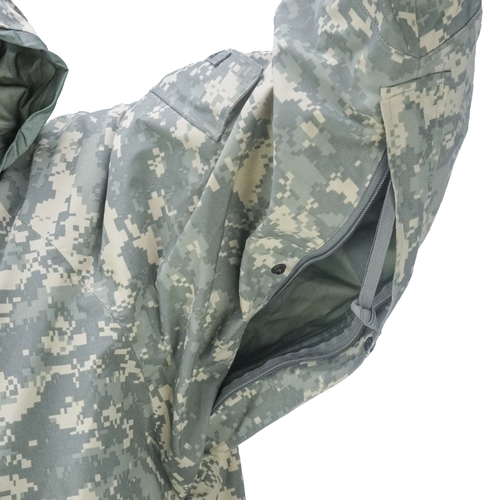 USGI ACU Gen II Gore-Tex jacket in UCP camouflage. It features a nylon shell with a breathable PTFE Gore-Tex® or equivalent membrane, along with a full front zip covered by a storm flap. The jacket includes a hood, adjustable cuffs, and upper arm pockets with flap closures. Underarm zip vents are present for added ventilation.