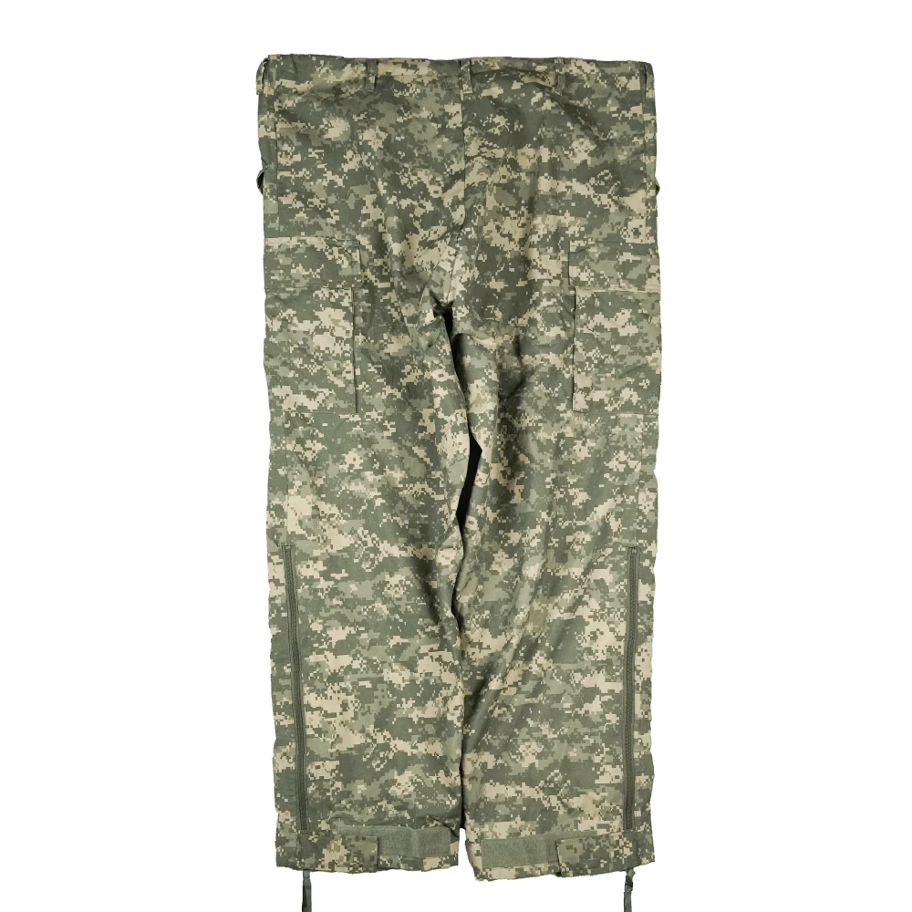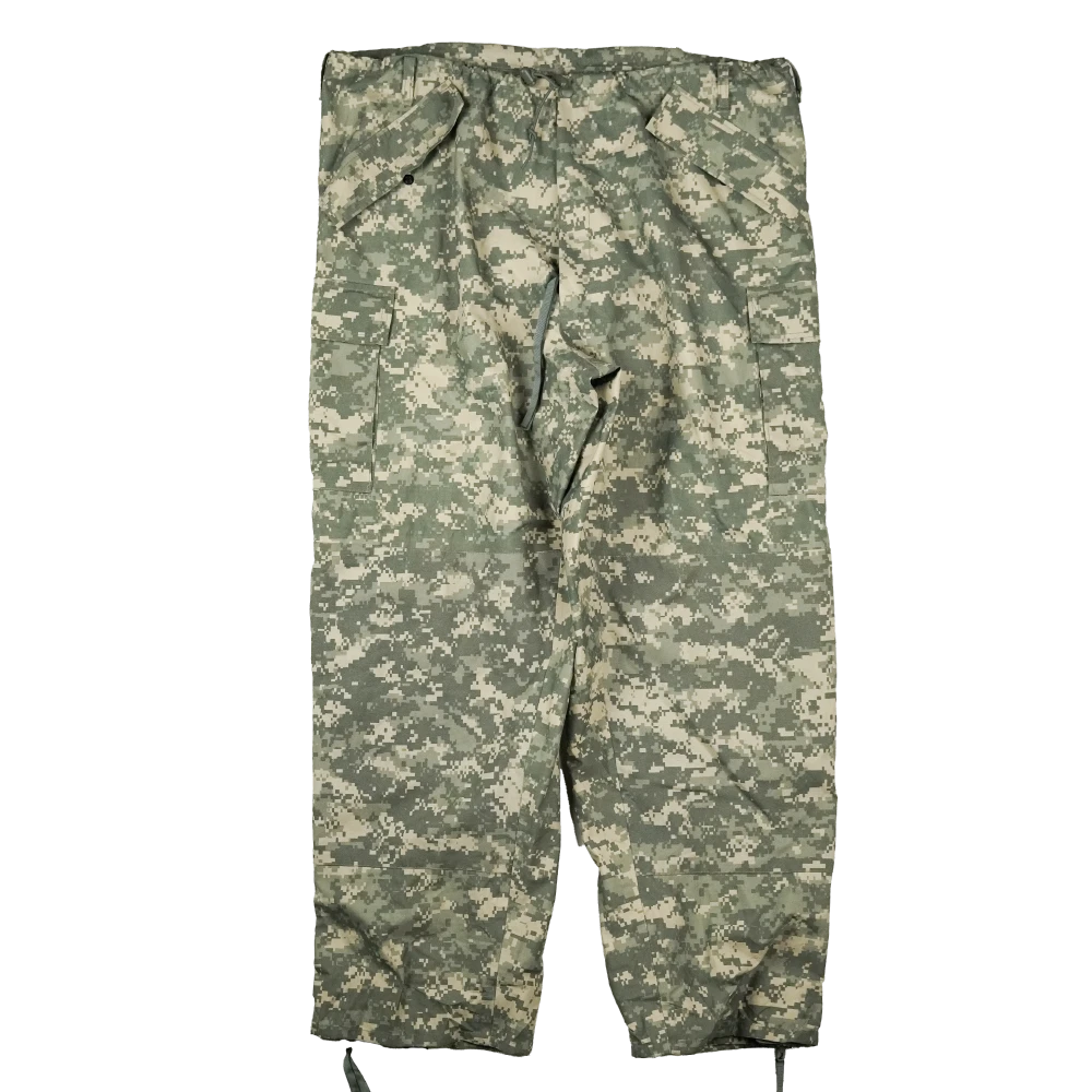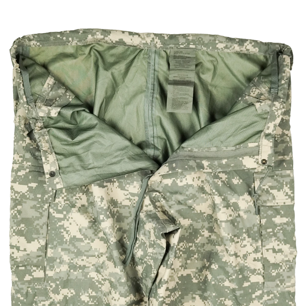USGI Gore-Tex trousers in ACU pattern. Waterproof shell construction with full-length leg coverage and sealed seams. Manufacture date 2007.