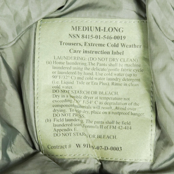 USGI ECWCS Gen III Level 7 insulated trousers. Part of the Extreme Cold Weather Clothing System, designed as an insulated outer layer.