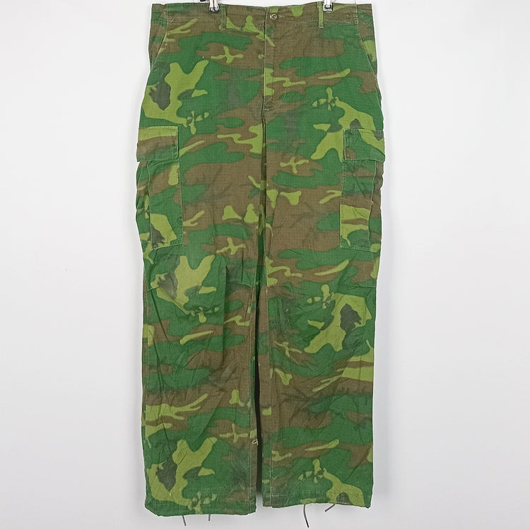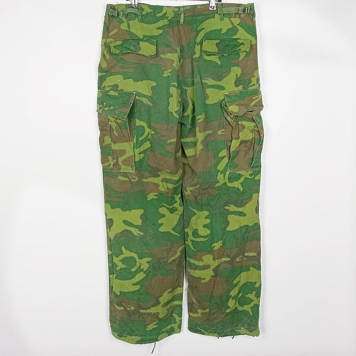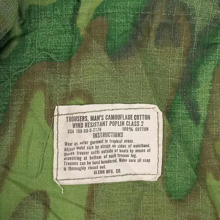 US issue slant pocket TCU ERDL jungle fatigue trousers. DSA appears to read 1968. A fantastic example of green dominant ERDL in a hard to find trouser size and quality.