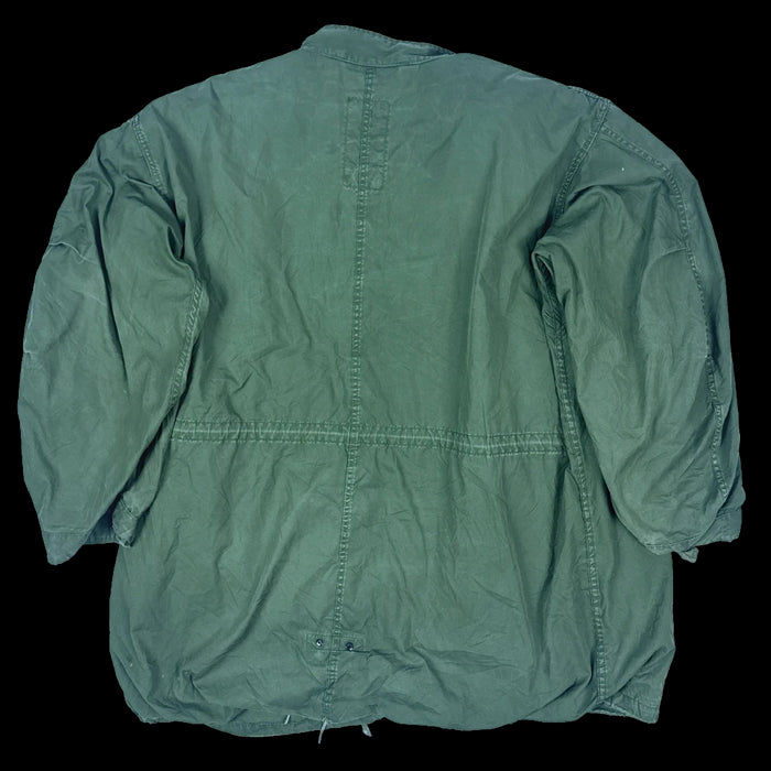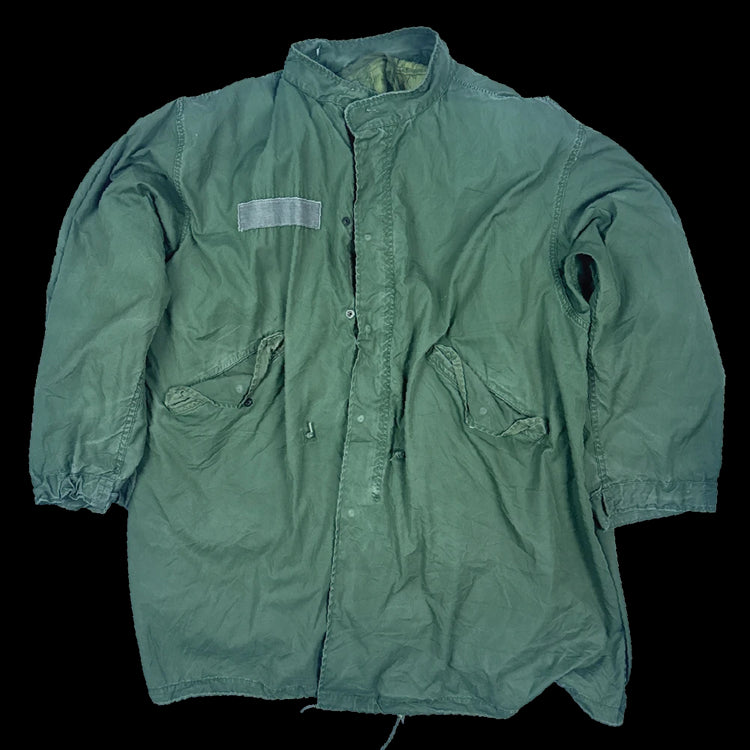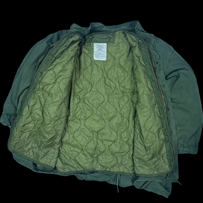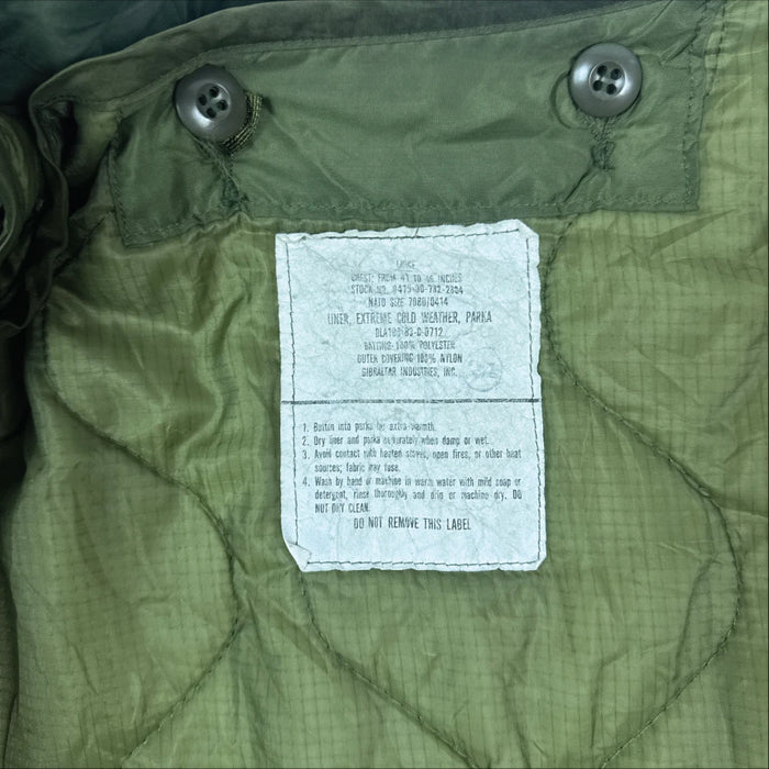 USGI extreme cold weather fishtail parka supplied with a detachable liner. The shell was manufactured in 1984 and the liner in 1983. The design includes lined hip pockets, internal attachment points, and adjustable drawcords.