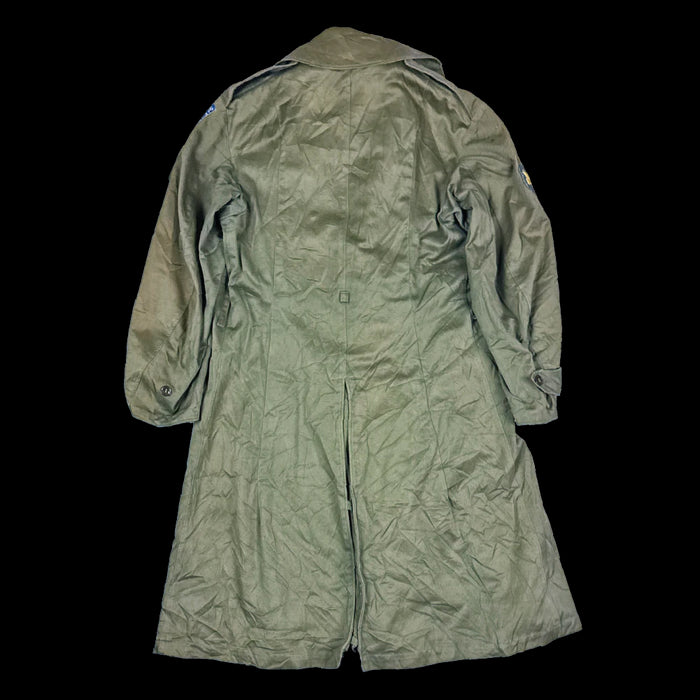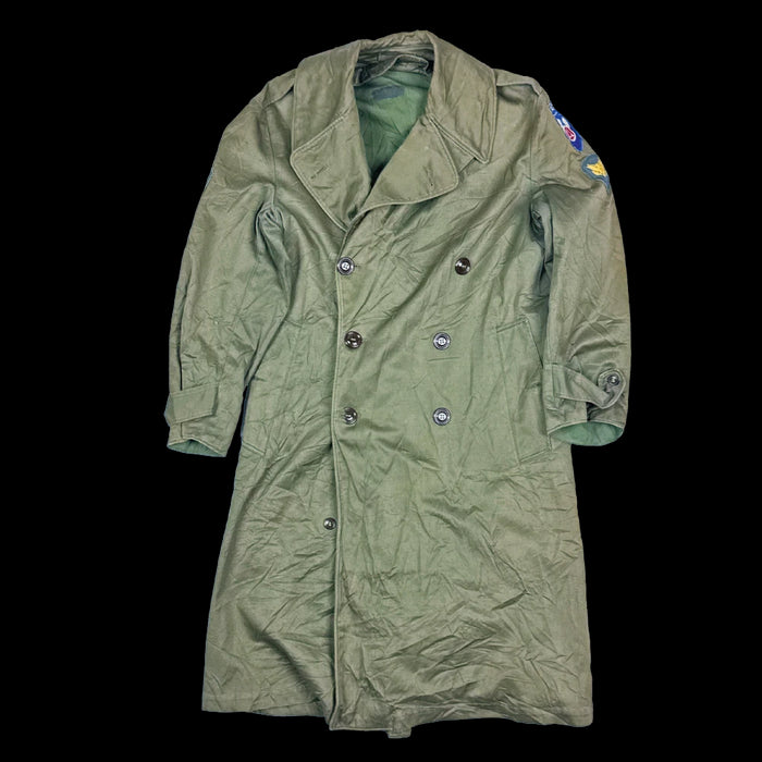USGI M-1950 overcoat with a double-breasted front. The coat features waist pockets with flaps that open further into the coat and button-adjustable cuffs.