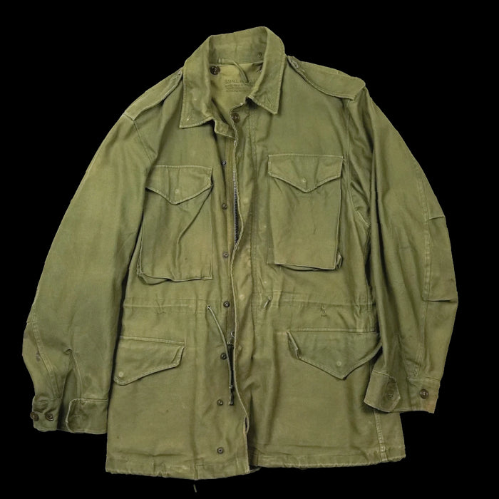 USGI M-1951 field jacket in surplus condition. This jacket features wool-lined hip pockets, buttons for attaching a liner, and buttons to secure a lightweight hood.