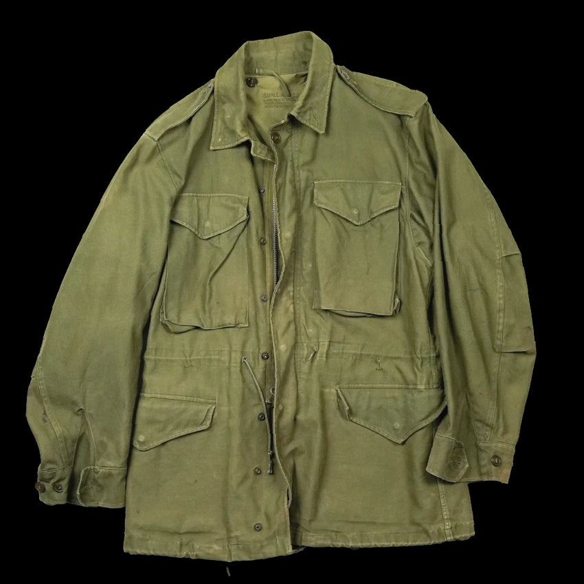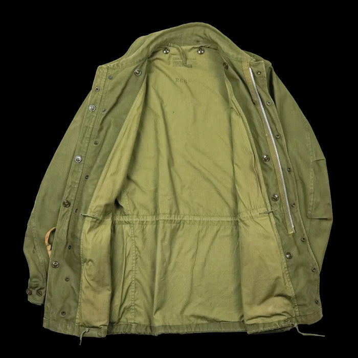 There is a small hole in the left front of the jacket. The left cuff button is missing and the right cuff button is broken. First introduced during the tail end of the Korean War, these were designed to replace the older M-1943 that were no longer fit for purpose in colder climates. This particular jacket is the Korean War model however has a subdued name and US Army tapes so likely saw use in the late 60s to 70s.
