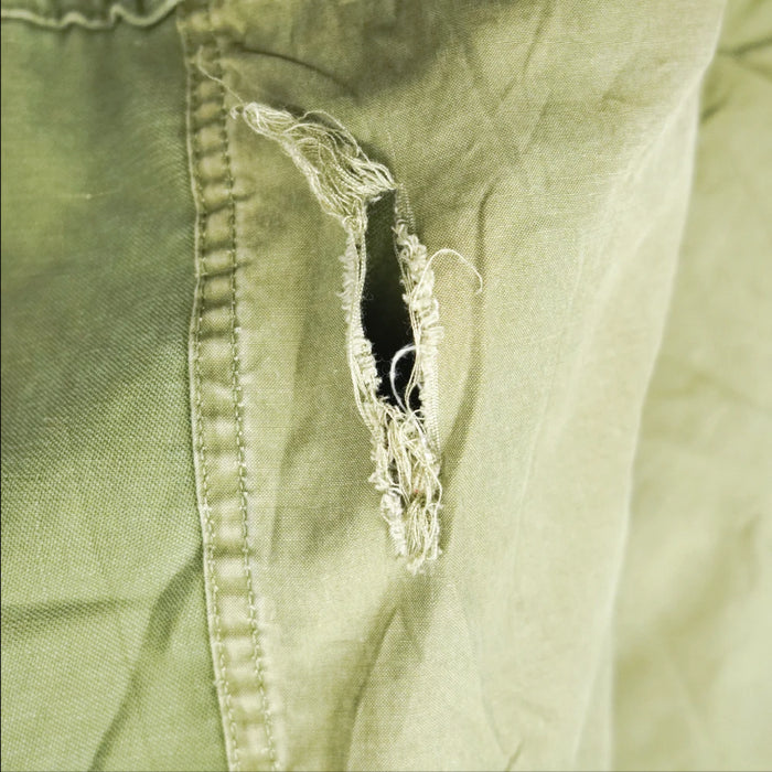 USGI M-1951 field jacket in Small Regular sizing. This jacket features wool-lined hip pockets, buttons for attaching a liner, and a tuck-away lightweight hood. The original label is missing, and there is a large tear in the liner.