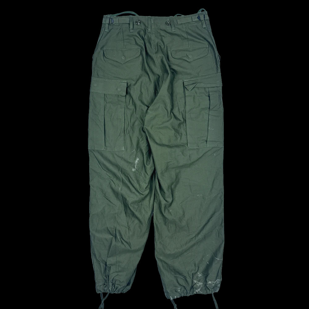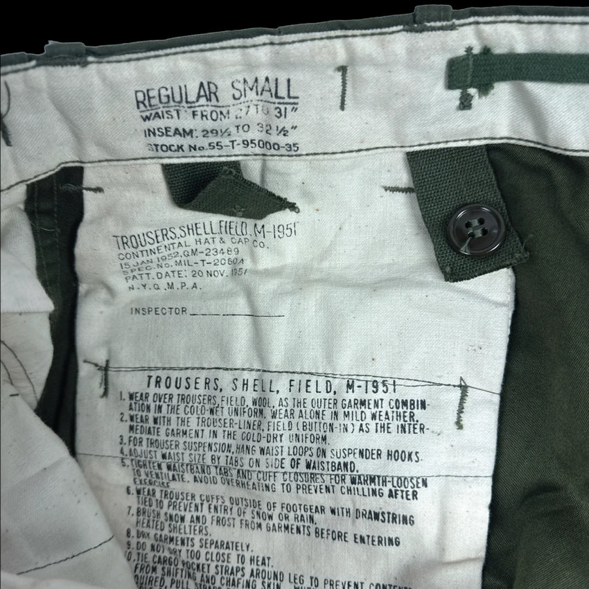 USGI M-1951 field shell trousers in Small Regular sizing. Shell-only trousers designed to accept cold weather liners. Features multiple pockets and suspender attachment points.