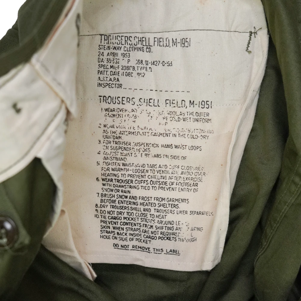 USGI M51 cold weather trousers in surplus condition. Heavy-duty military-issue trousers designed for cold conditions in the M51 pattern.