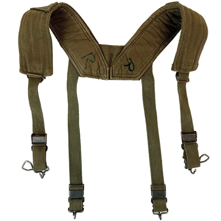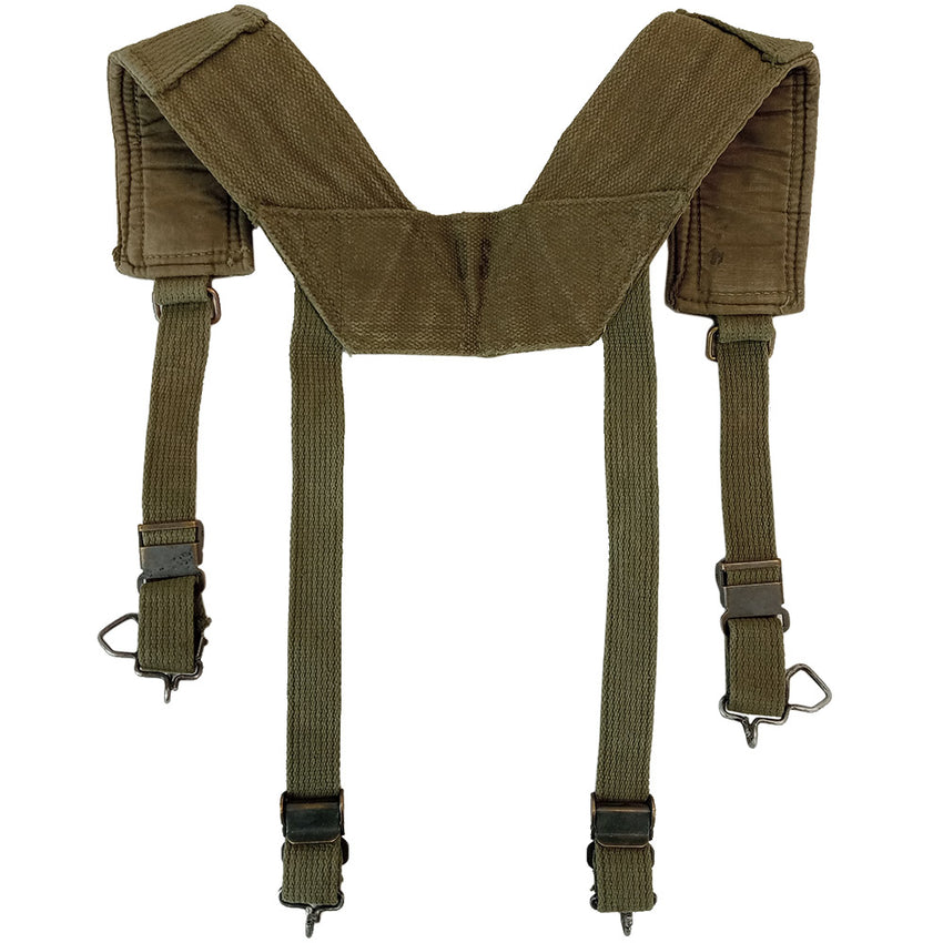 The period between World War 2 and the Vietnam War was a mish-mash of gear for US soldiers. The M-1956 Load-Carrying-Equipment (LCE) was intended to replace all former webbing systems and became the dominant system for the War in Vietnam. The largest improvements over former systems was the weight distribution and the modularity to add pouches easily depending on your mission. These suspenders were no less modular and could often be found being married up to older WW2 BAR belts - pretty much anything with eyelets.