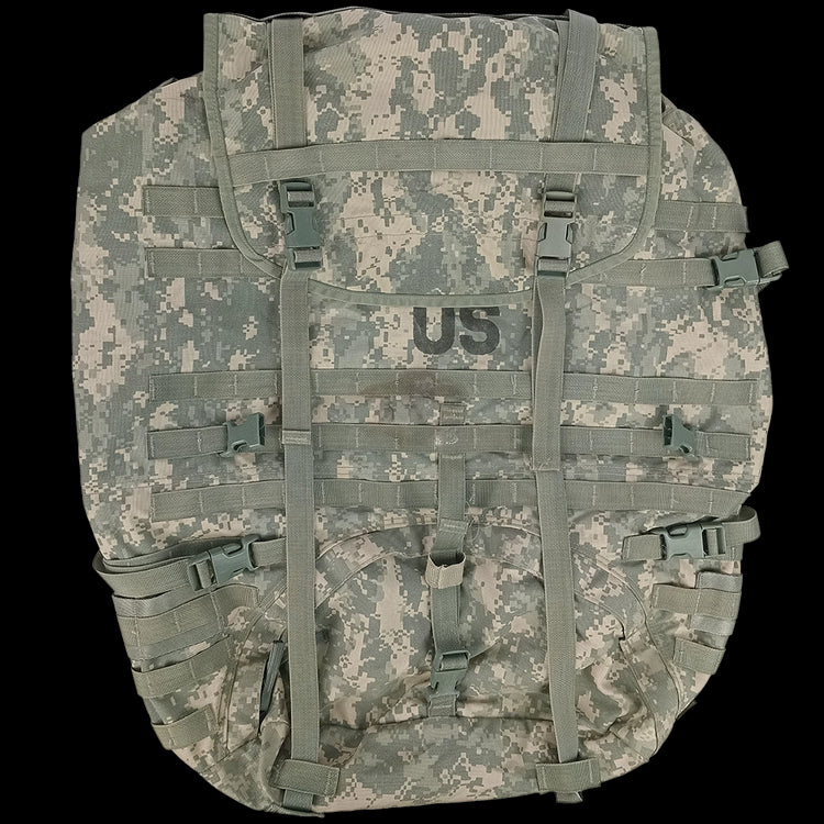 UCP pack, no straps, no frills. This is a large rucksack from the US Army. Officially known as 'Equipment MOLLE II Rucksack, Large'. This is a big pack, and if you like to punish yourself with extra weight to carry, expand this packs capacity with any manner of large and small pouches via the multiple PALS webbing straps.
