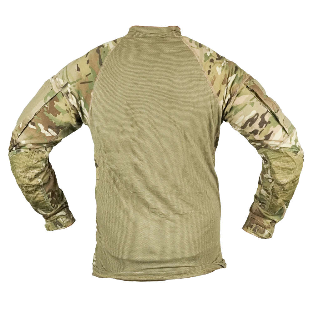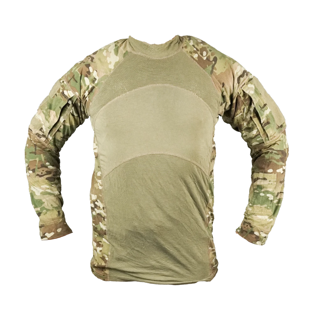 USGI UBAC shirt in OCP camouflage. This is a surplus combat shirt with a woven torso and reinforced sleeves, designed for wear under body armour.