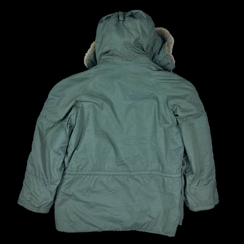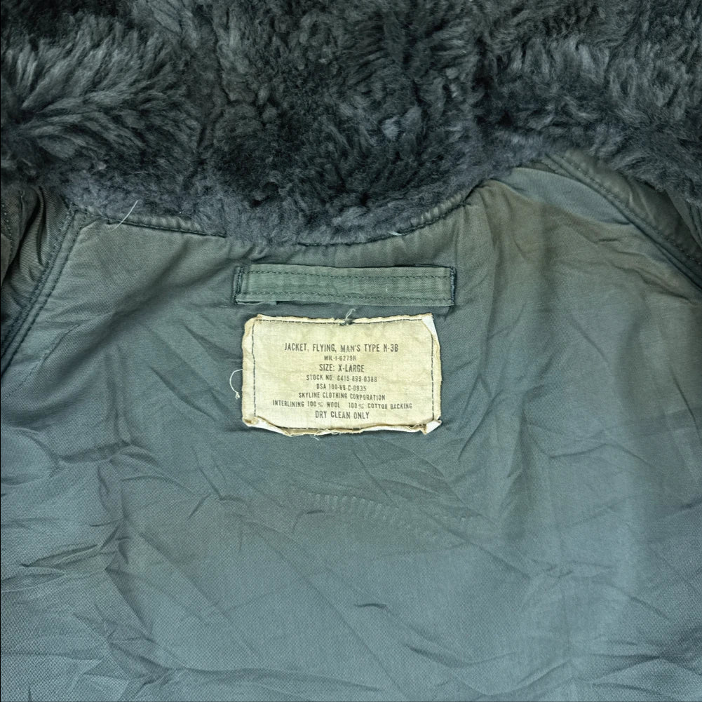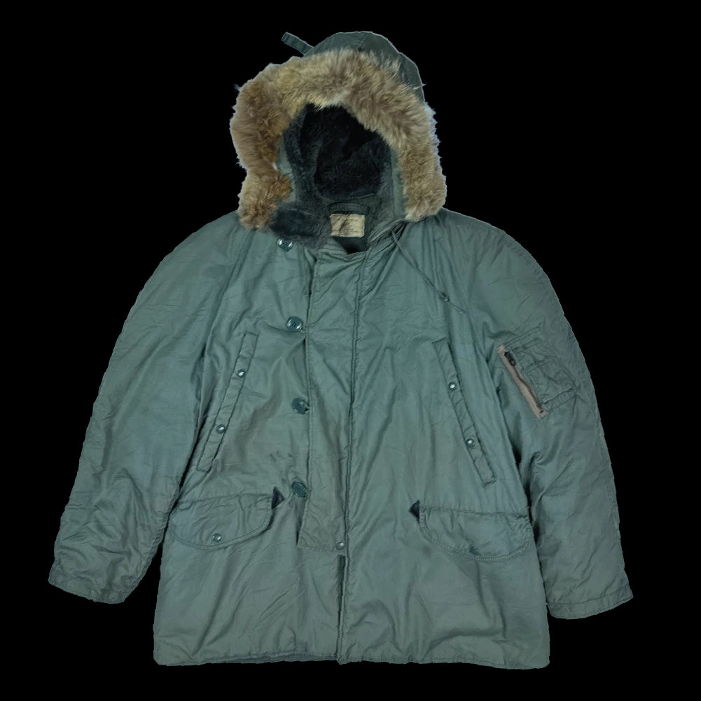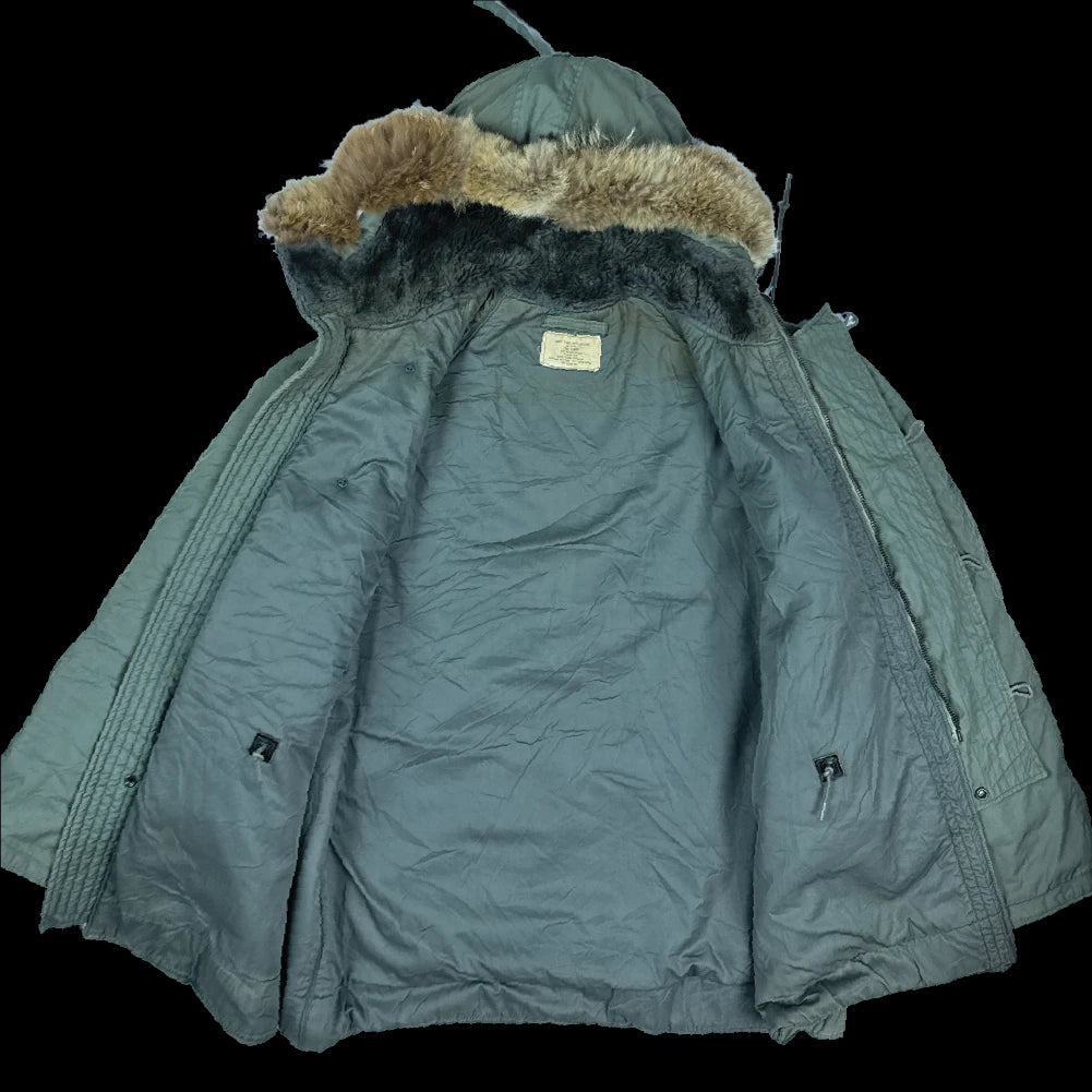 USGI N-3B extreme cold weather parka in size XLarge. Manufacture date is 1969. The parka features a synthetic-lined hood with fur ruff and lined hip and waist pockets.