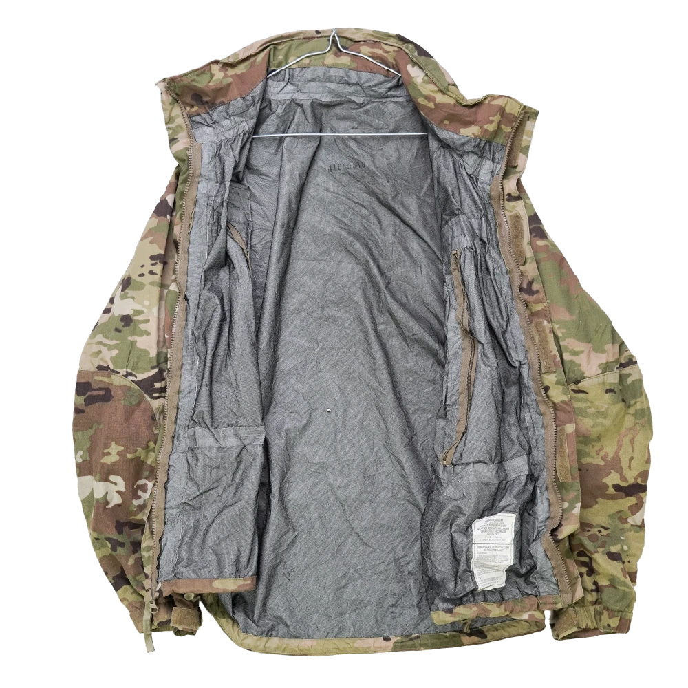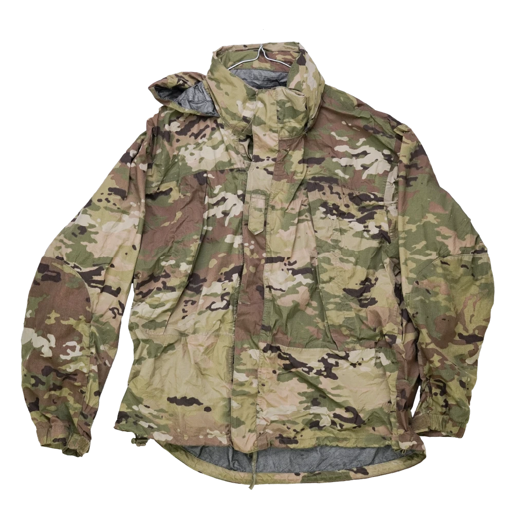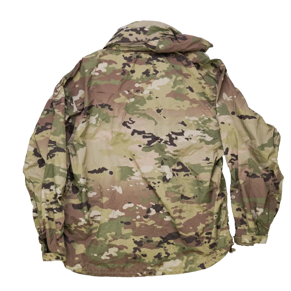 USGI ECWCS waterproof jacket in OCP pattern. This is a Gore-Tex shell jacket with a full front zip and adjustable hood, designed as part of the ECWCS layering system.