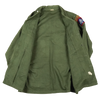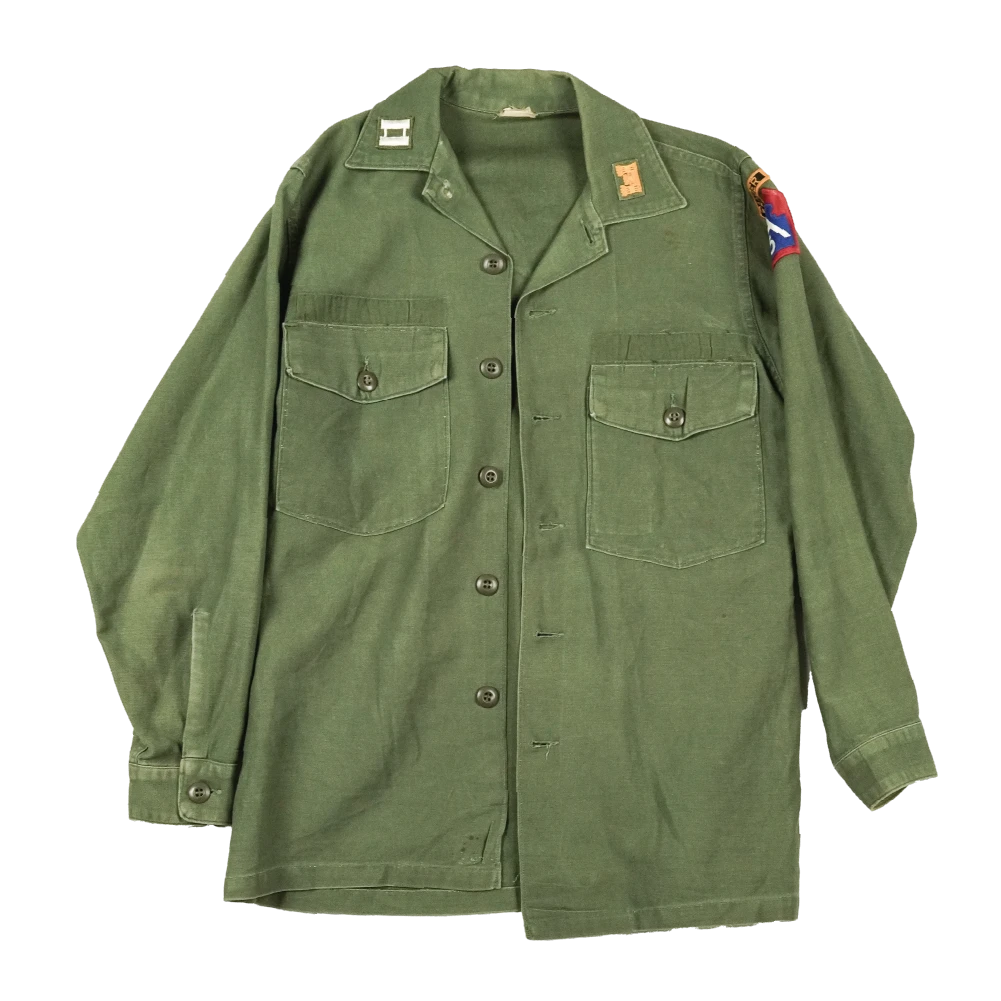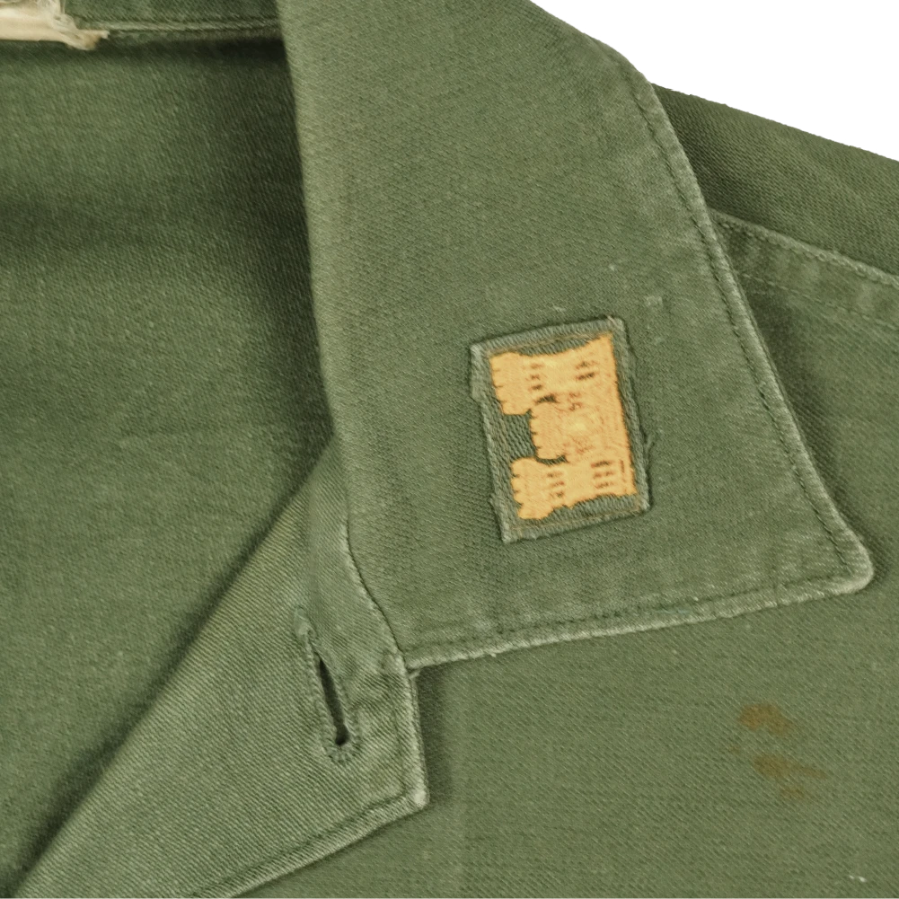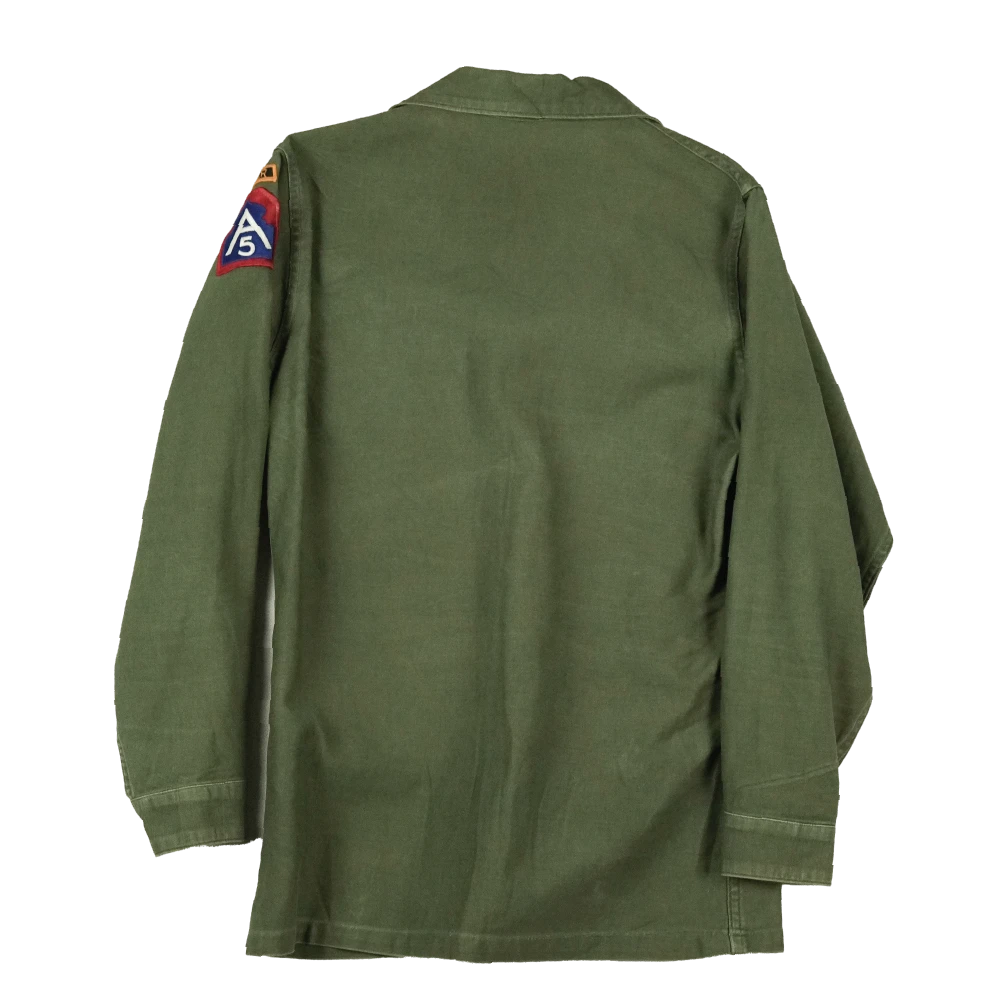 USGI OG-107 utility shirt in used condition. Features a small stain on the upper left chest.