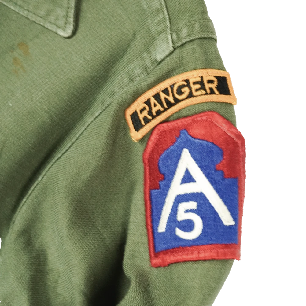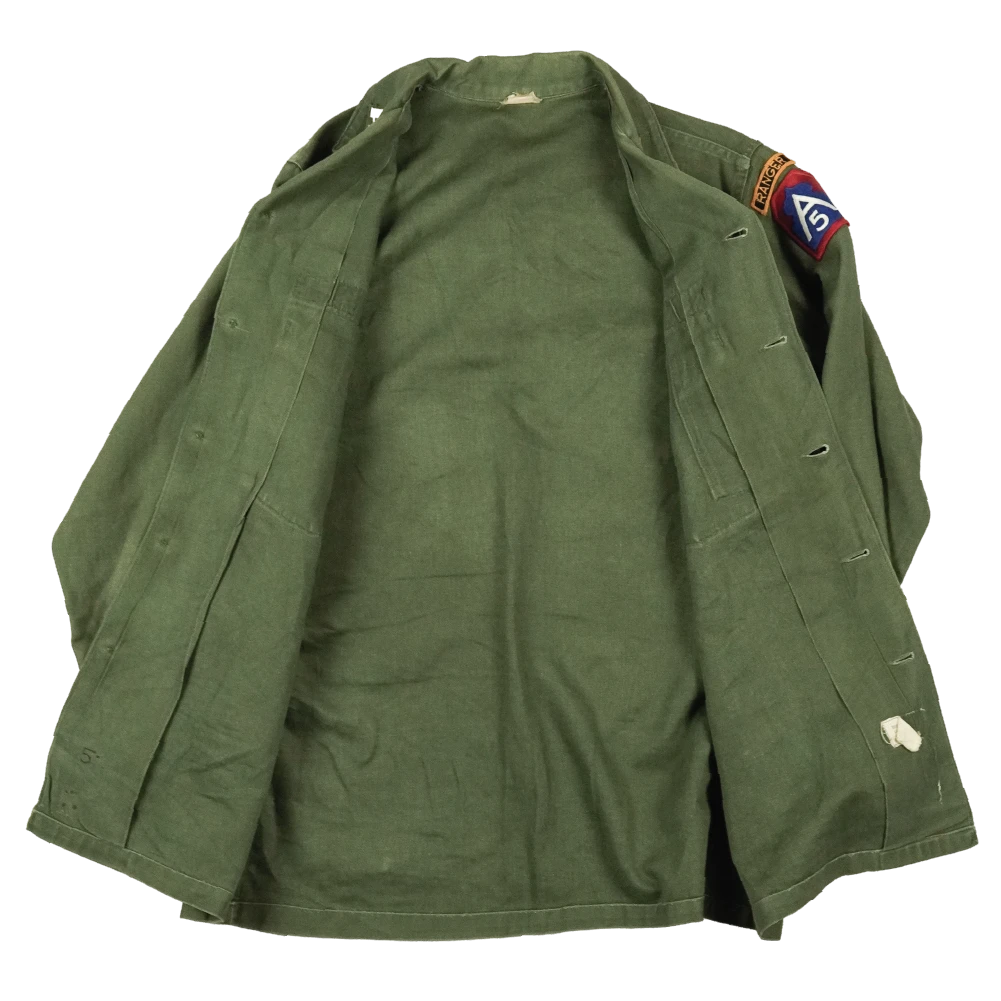 The shirt displays Captain and Engineer insignia on the collar, with a US 5th Army patch and Ranger tab on the left sleeve. Contract number 7343 is present.