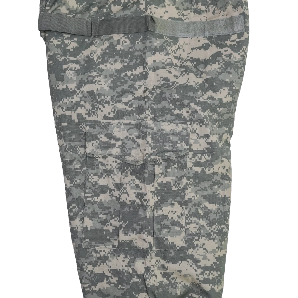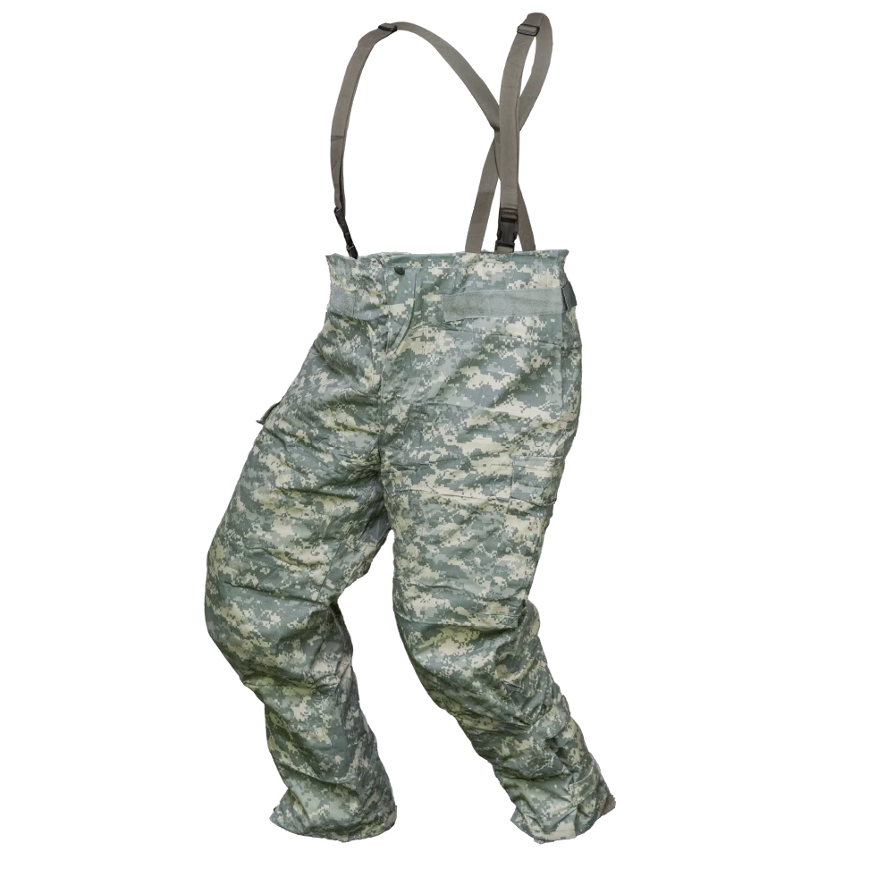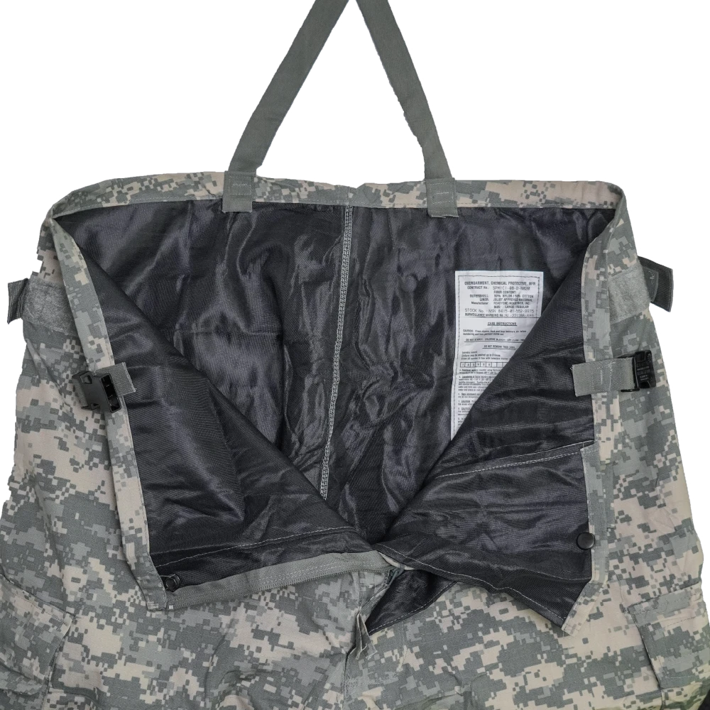 USGI UCP NBC Trousers in UCP digital camouflage. Constructed from a 50% nylon / 50% cotton outer shell with a protective liner. Designed as an overgarment with integrated adjustable suspenders, waist adjustment tabs, cargo pockets, and adjustable ankle closures.