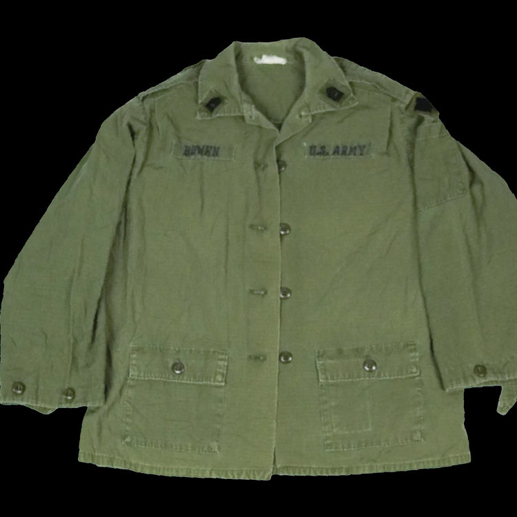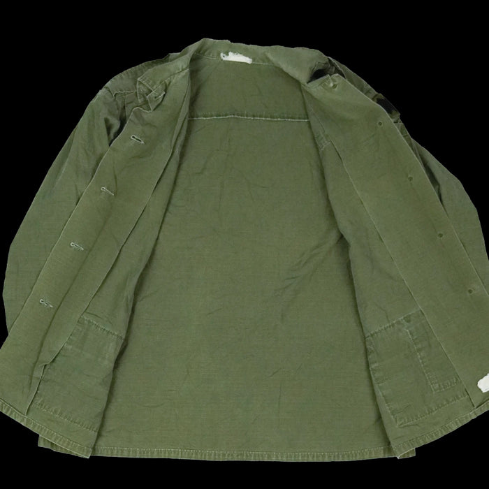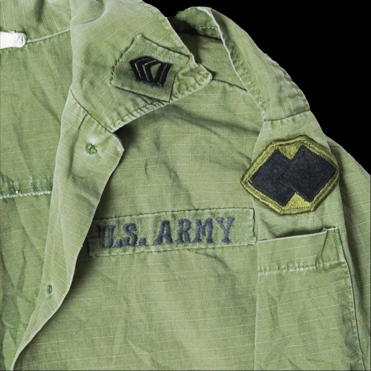 USGI women’s OG-107 ripstop field shirt. Features button-closure hip pockets, a left sleeve pen pocket, and adjustable button cuffs.