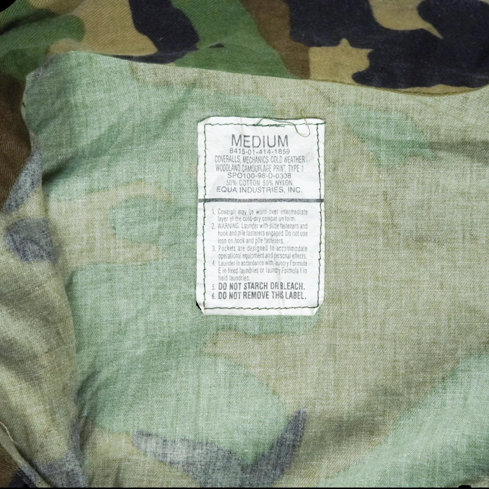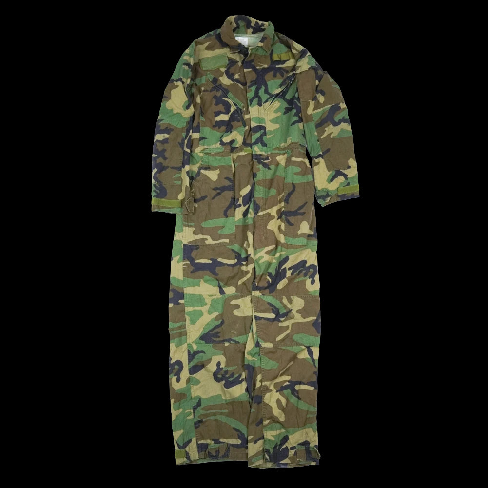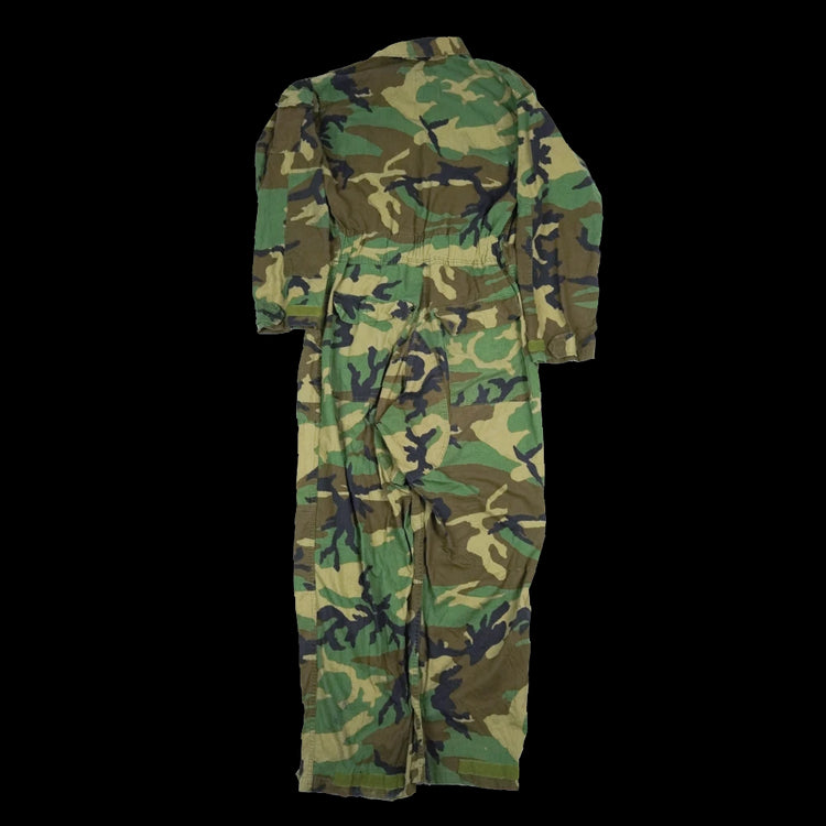 USGI mechanics coveralls in woodland camouflage pattern. Manufactured in 1996. One-piece coverall construction with multiple storage pockets and adjustable cuffs.