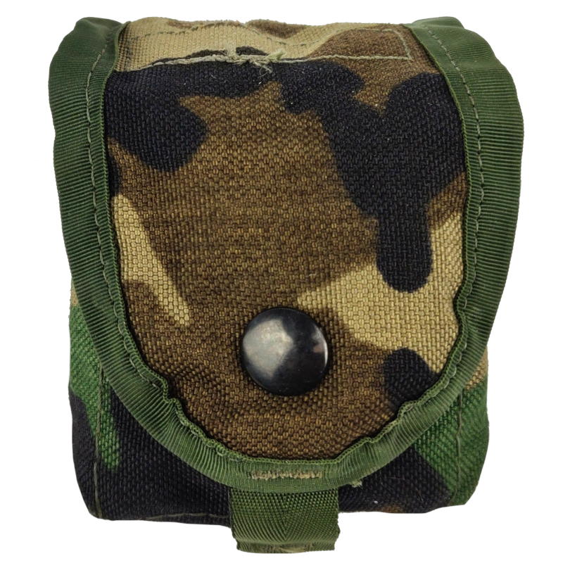 These woodland camouflage grenade pouches are genuine surplus from the US Army. Manufactured by Specialty Defense using tough Cordura nylon. Designed to hold a fragmentation grenade on a MOLLE combat vest and other MOLLE compatible gear.