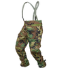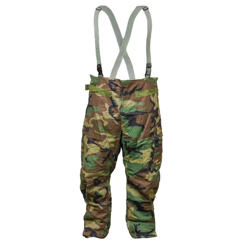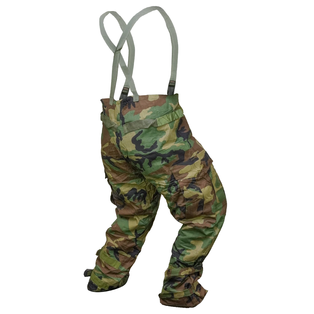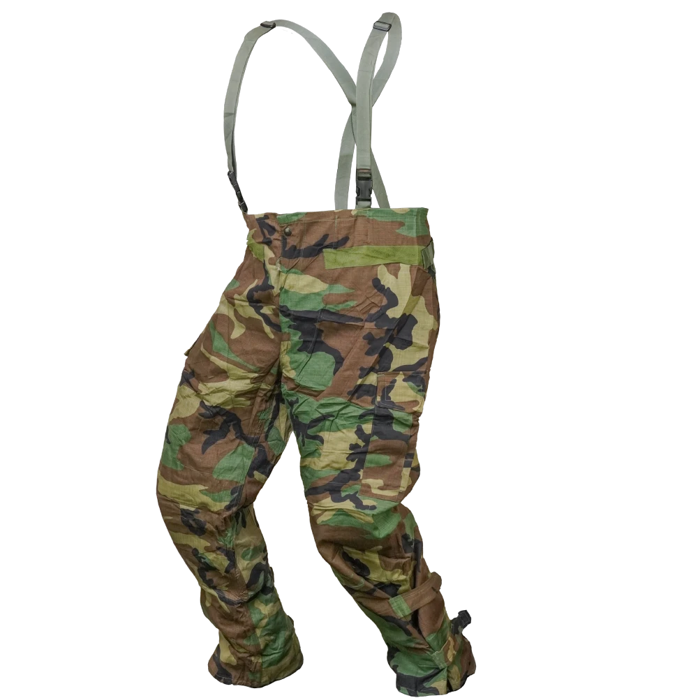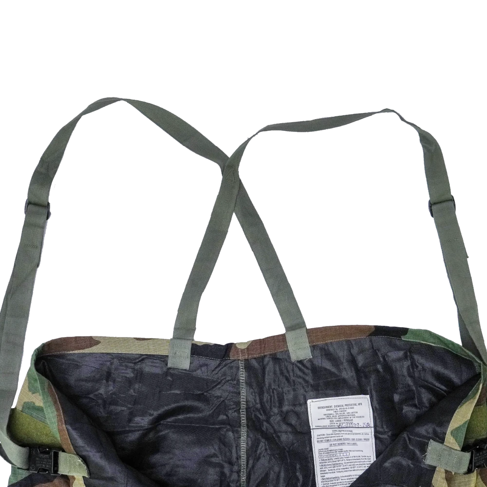 USGI Woodland NBC Trousers in Woodland camouflage. Constructed from a 50% nylon / 50% cotton outer shell with a protective liner. Designed as an overgarment with integrated adjustable suspenders, waist adjustment tabs, cargo pockets, and adjustable ankle closures.
