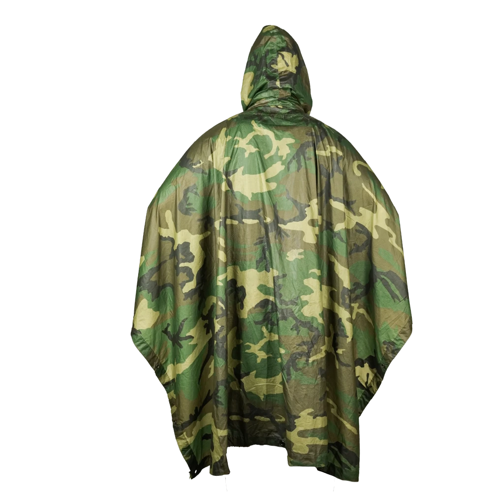 U.S. Government Issue woodland camouflage poncho produced to U.S. military specifications for wet-weather use. Lightweight construction with an integrated hood and snap fasteners along the sides.