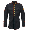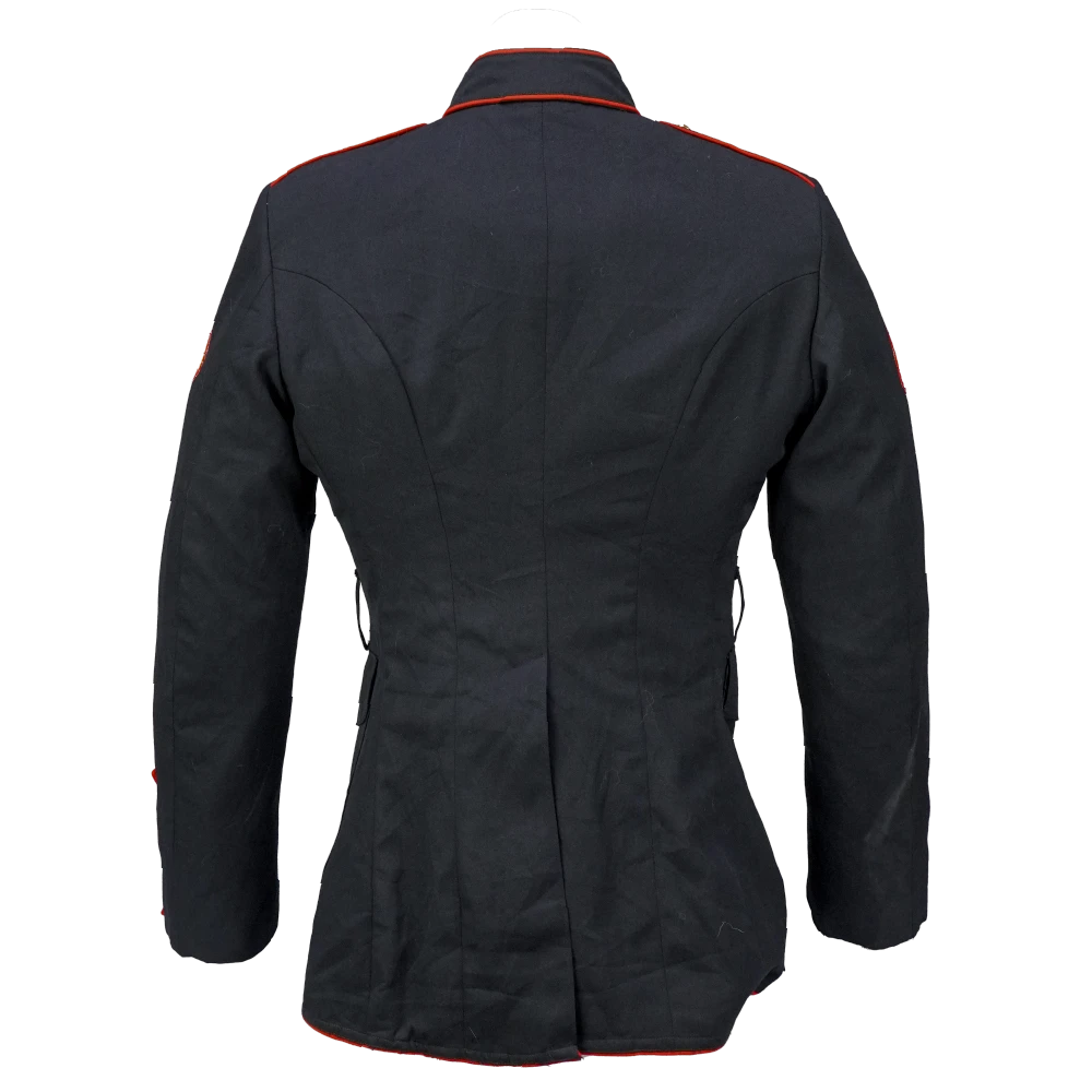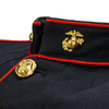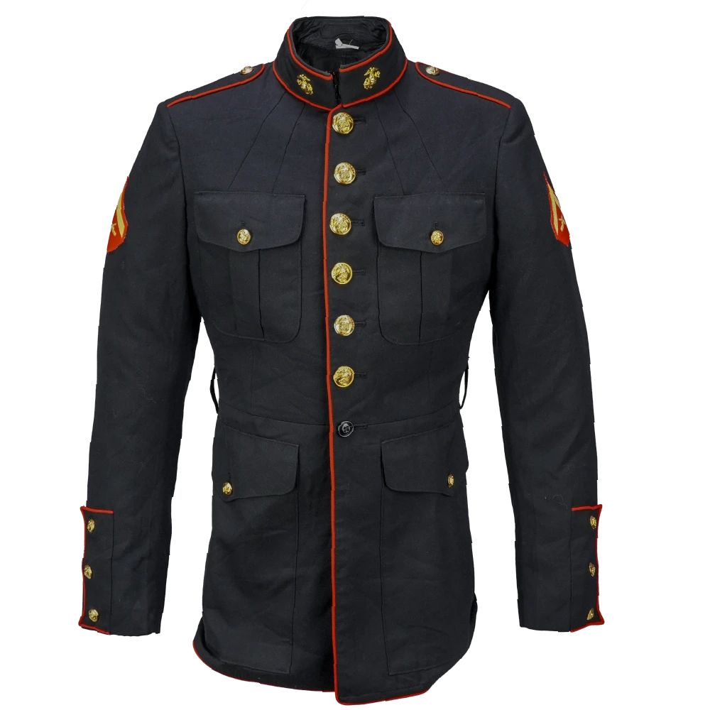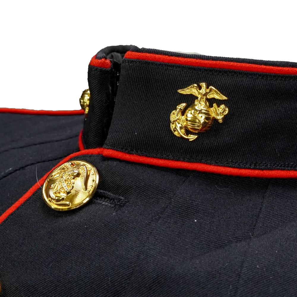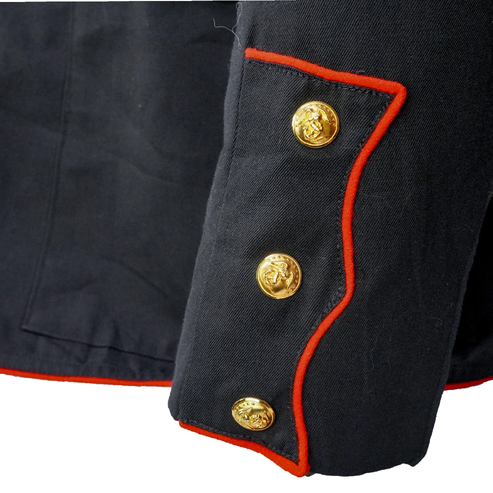 USMC blue service dress jacket in a very dark shade of blue, appearing almost black. Made from a 60% polyester / 40% wool blend, it features a structured tailored cut with a stand collar, red piping along the front opening, collar, cuffs, and shoulders, and multiple brass buttons with embossed insignia. The jacket includes two chest pockets and two lower pockets with button closures, as well as crossed rifle insignia patches on the sleeves.